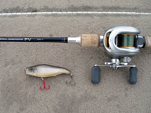 明日はメバリング少々と管理釣り場の贅沢2本立てしていきます♪メバルはサイズが出ない場所らしいので下げ潮のタイミングで数釣り楽しんできます。エリアは巨大魚が釣れる場所ですのでバスロッドを持っていきます。それが今回紹介するミノーとトップウォーターに使っているタックルです。シマノ ファイナルディメンション PVー168ML+シマノ 07 メタニウムMg7 左僕の大好きなソリッドトップ・エクストラファーストテーパーなロッドですが、ミノーやトップウォーターに使い勝手も良くお気に入りになってます。リール:ロッドも軽さに合わせてリールもシマノ 07 メタニウムMg7 左で軽いタックルセットになっています。ジャークやトゥイッチもしやすくていいですよ~♪ライン:おおのオリジナルナイロンの3~3.5号をセットします。この手のジャンルのルアーを使う時は乗りが良く、遠投性能に優れるナイロンが一番です。プラグ:5~18g位のトップウォーター、ジャークベイト、ダイビングミノーを多用しています。とにかくこのPVシリーズのコンセプトに乗っ取ったとてもトップ、ミノー系ではバーサタイルに使えるロッドです。またこの手のルアーを使う時に重要なショートハンドルなので、ジャークもし易いですね!!6.8フィートの長さも遠投性に優れています。余りまだ良いサイズは釣っていませんが、バットパワーもありそうなので是非良い魚を釣りたいですね~。(出来ればバスを(笑))