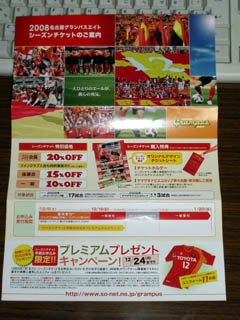 昨日ついに意を決してシーズンチケットの申し込みをしました。リーグ戦17試合とカップ戦3試合の計20試合!!20試合のうち5試合は豊田スタジアムでの試合になります。まとめてなので後の請求金額が恐ろしいですが、1試合あたり1300円と格安ですし、行けない試合も数試合出てくると思いますのでその時は格安スタートのオークションで売ってしまえばいいかな~と思っています。ゴール裏なのであまり必要ないですがチケットホルダーももらえますし、チケット自体が全部繋がっていてデザインものなので他では買えないものがちょっとしたレア感でもあります。そして最近のグランパスの動向も活発に獲得しているようですね。三木、バャリツァ、マギヌン、深井といい選手を獲得しています。特に最近でもJリーグで実績を残しているマギヌンには期待しています。若いし、日本語もかなり習得しているとの事!!後は家長と右サイドの問題でしょうかね?左サイドが若干渡邊一人では不安ですしね~。3バックの場合は阿部を左サイドハーフに上げるのも有りですが。右は最悪恵太か津田を完全コンバート、又は小川、マギヌン辺りも有りかな~と思うので、やはりキーは左サイドです。いい選手の寄せ集めになるか、それともピクシーが自身のカリスマ性で引っ張るかとにかく開幕までドキドキしちゃっています♪