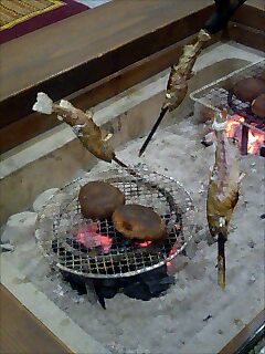 今日民宿での晩御飯は囲炉裏で焼き魚やでけ~椎茸です