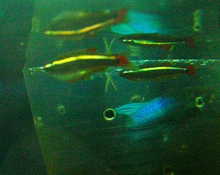 昨夜、深夜だったかなぁ。寝る前に、ベッド横のシュワ水槽を覗いてみた。一匹だけいるレッドビーが、忙しなく何かを追いかけていた。何を追いかけてんだろう?よく見ると、半透明の小さな生き物でした。これは何??ついに産まれました~。ミナミヌマエビの仔。はぁ~、こんなに小さい。一昨日見た時には、いなかったのに。と言う事は、昨晩産んでいた訳ですね。で、朝見ると増えておりました。ざっと数えて11匹。凄いなぁ。皆、無事大きくなってくださいよ!