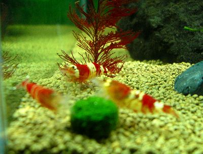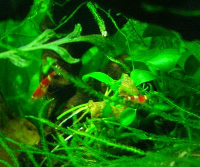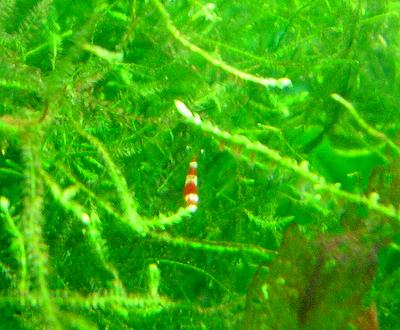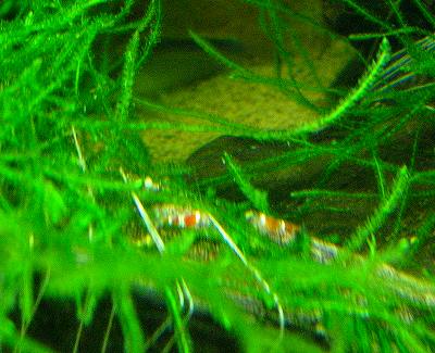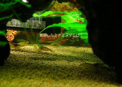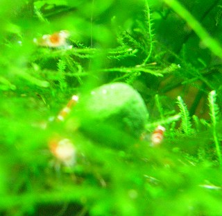 エビの餌が無くなった~。早く買わなきゃと思いつつ、近所には売ってない。で、他のブログ仲間から頂いたクロレラ、投入してみました。 で、少し時間を置いて見たら、ビー仔たちが群がっております。大きい仔、小さい仔合わせて6匹来てます。その近くにも、5匹、4匹計15匹が探さずに見る事が出来ました。ミクロソリュムの葉にも、3、4匹います。シェルターの中にも、ウィローモスドームの中にも、2、3匹います。いったい何匹いるのか分かりません。 抱卵ちゃんです。この子は、まだ卵の色があるんですが、もう1匹、卵が透明になってきている子がいます。もうすぐ産むのかなぁ??