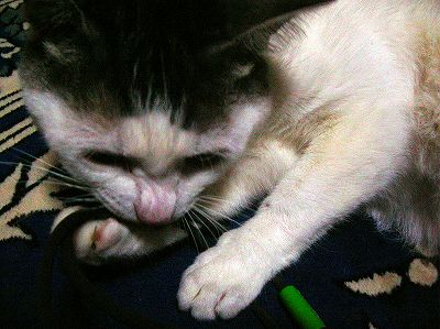 いつも夕方は、みーが遊んで暴れているのに、今日に限ってず~っと寝てるんです。一人でお留守番している間に、暴れまわったのか疲れてます。あまりに静かに寝ているので、頭にねずこうを置いてみました。いつもなら嫌がって、振り落とすんですけど、この状態で20分ず~っと寝てました。何だか、動いていて欲しいなぁ、と思っちゃいますね!とても静かなみーでした。