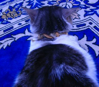 みーです。お久しぶりです。後ろ姿なんですが、首輪を今凝っているマクラメで作ってみました。これが前です。トップにローズクォーツの勾玉といつもの鈴。グラスビーズを使ってます。何だかお気に入りのようで、緩んできたから縛り直していても、動かずじーっとしているみーでした。最後の写真を撮る前に、大格闘しました。私の手とみーです。動画撮って見たんですが、写ってはいけないものが写りこんでいたので、載せる事が出来ません。大格闘の後、疲れて弟の横で、眠ってしまいました。ちゃんちゃん!