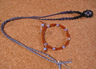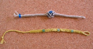 暫らく更新しておりませんでした。なぜかといいますと、これを作っていたのです。初めてするものでしたので、上手くは出来ていません。マクラメとは、ヘンプ糸を編んでいくものです。鈎針や棒針で、編み物は出来るのですが、結構難しかったんですよ。黄色いブレスが、一番初めに作ったものです。緑色のは、天然石のジェードです。二番目に作ったのが、青メノウの石を使っています。マクラメ用のビーズを捜しているんですが中々見つかりません。ねんじゅを崩して、作ろうと試みたのですが、通し穴が小さすぎて紐が通らないんですよね。次は、自分のを創ろうと思います。上手く作れるのか心配・・・。