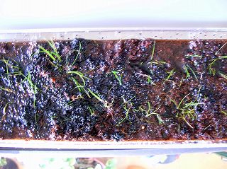 今日、2つ目。これ何でしょうか?増やそうと思って、ケースに土を入れています。増えたら、また、水槽の中に植えようかと思っております。田んぼに植えてある米の苗みたいです。本当に増えてくれるのかなぁ。楽しみです。