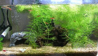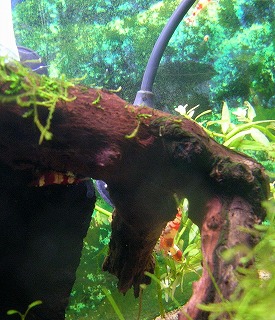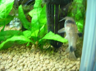 パンダ水槽、簡単にお掃除をした日の次の日だったかなぁ。水槽前を横切って見てみると、何か不自然な子がいる。隅っこにいたんだけど、こんなポーズで。見事に立ってます。尾っぽで、器用に。吸水口に寄りかかっている訳でもなく。このパンダ水槽、苔が酷くって、まだ、クロ髭は撤去してないんですけど、水草に生えたクロ髭は、カットしたりして処分しました。で、硝子面に付いたクロ髭は、メラニンスポンジでゴシゴシ。半量の水替え後、例の怪しい粉を耳掻き2杯分を投入。さぁ、これで苔はどうなる。生えてこなかったらこれは、凄すぎる。