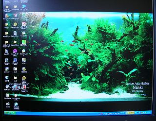 綺麗な水景の壁紙を満田さんより頂きました~♪うううっ~、綺麗過ぎます~♪♪♪見て下さい。アイコンが非常に多いので分かりズライですかねぇ。それに何だか小さくって見えにくいし・・・。ちょっと大きめで撮ったのはこれ。何だかスッキリしませんね。いやいや、本当に満田さん、有難うございます。何度も再送して頂きました。お忙しいのに誠に申し訳なかったです。無事、今回ファイルを保存する事が出来ました。自宅のパソコンにも壁紙はります。こんな綺麗な水景、私には無理ですけど、水草レイアウトしようと思ったら、努力とお金が必要ですねぇ。水草って、結構お高いし、照明、Co2揃えていたら大変な事になっちゃいます。でも、自分でも作りたい。ので、お金を貯めてADA買おうかと思います。(いつになるやら~。)
