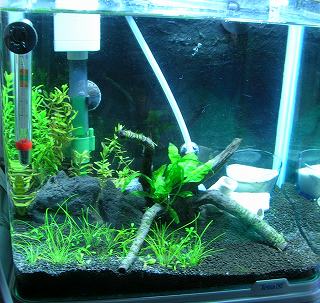 ビーを選別する為に買った30cm水槽の今です。前景にショートヘアーグラスとグロッソ。中景は、無しで後景にこれ何だろう?ムネチカさんの所で買ったら一緒に入っていた。を入れてます。1ヵ月後どうなるんだろう?綺麗なレイアウト?水槽になるのかしら~。