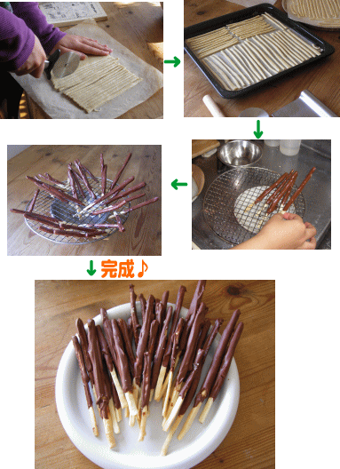それを薄く延ばして、さらに幅3mm位に切っていきます。切ったら間隔をおいて天板に並べ、180度に熱したオーブンでこんがりするまで焼きます。粗熱が取れたら溶かしたチョコレートをからめて、立てた状態で冷まします。ボウルにのせた焼き網の穴に立てていって、なんとかうまく乾きました。