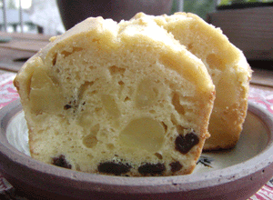 お芋が美味しい季節。パウンドケーキに焼きこんでみましょう。ラム酒をちょっと加えるとぐんと風味が良くなります♪<材料>さつま芋 250~300g砂糖 大さじ3ラム酒 大さじ2レーズン 1/4カップ(お湯につけてから、ざるに上げておく)バター 90g(室温で柔らかくしておく)砂糖 大さじ6卵 2個薄力粉 100gベーキングパウダー 小さじ1牛乳 大さじ1<作り方>オーブン予熱 190度1.粉類はあわせてふるう。 さつま芋は小さめの角切りにして、ひたひたの水と砂糖を加え、 柔らかくなるまで煮る。2.煮えたら水分を飛ばして火を止め、ラム酒、レーズンを加える。 (好みで適当につぶす)3.バターと砂糖を良く混ぜ合わせ、卵を一個ずつ加えてさらによく混ぜる。 牛乳も加える。4.粉類を加えてさっくりと混ぜ合わせ、さつま芋も加える。5.パウンド型に流し入れ、オーブンで30~35分くらいかけて焼きあげる。