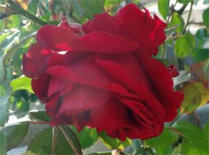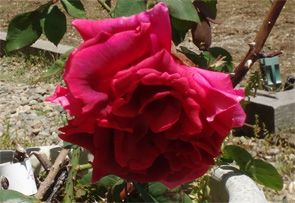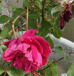 大きくて7cm小さいと4cm程度の赤いカップ咲きの花が春から初冬までいっぱい咲き続け、濃厚な甘い香り、ほんとに細めの枝に枝垂れるようにたくさんの花を咲かせるがんばり屋さんだ。頑張りすぎて花後に黒点にかかりやすいが、消毒したり、大雨の時は軒先に移動したりぐらいは、こちらも頑張らないと。