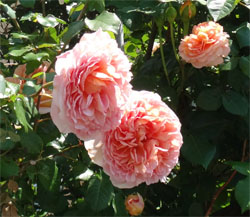 半ツルで、縦横に伸びて、ソフトピンクからアプリコットまで様々なカップ咲きの花をいっぱいつける。フルーティーな香りも見事。大好きなバラ。