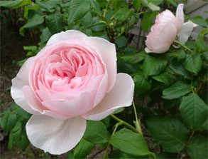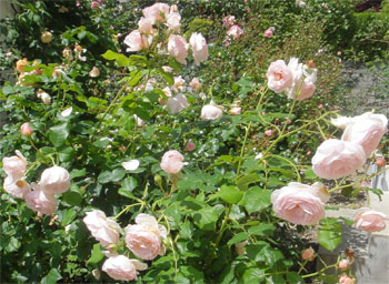 イングリッシュローズのヘリテージ。ソフトピンクのきれいな花で、暑い時期は白っぽくなって花持ちも悪いが、3年目でようやく夏もいっぱい咲くようになった。と同時に、一段と大型化してきた。やっぱりアイスバーグの子供だけはある。