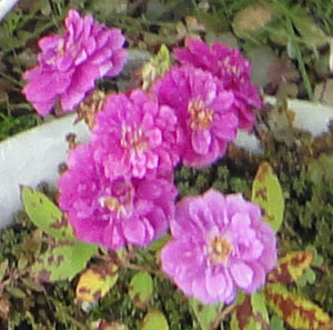 ミニバラのスイート チャリオットは、アメリカの有名なミニバラ作出家のムーア氏の名作。地植で高さ幅とも40cm、鉢植えで30cm程度の横張りで大きめの樹に、しだれるように小さな濃いライラックピンクの花をたわわに咲かせ、ミニとは思えないダマスクの甘い香り、四季咲きも良好、強健で病気にもかかりにくく、限りなくパーフェクトに近いミニバラ。