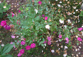 ライラックピンクの小さな花で、ミニバラなのにダマスクの甘い香り。四季咲きもまずまず、強健で、黒点には少しかかるけどいつも葉っぱいっぱい。