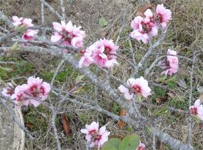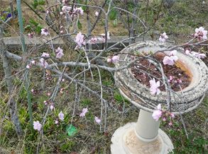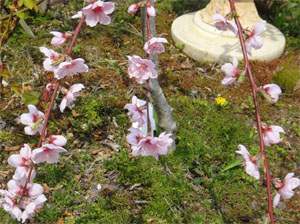照手水密は、花桃&食用桃で、春は花を観賞し、夏は1本でも実がなる、とても便利な桃だ。今年は、桜より少しだけ遅れて咲いた。ソフトピンクのかわいらしい半八重の花と しべ、去年いっぱい咲いたせいか今年はあまり咲かなかった。まだ4年目ぐらいの若木なので、一年咲いては次はあまり咲かずの繰り返しなのかも。あるいは、去年、派手に縮葉病にやられて葉っぱをなくしたせいかも。今年は、実がなるか怪しいけれど何とか頑張ってほしいなあ。