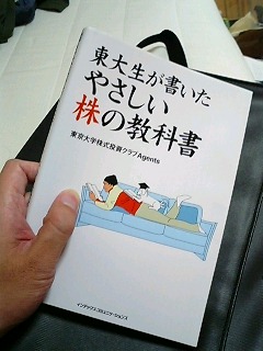 完全初心者の私がまず解決しなければならない問題それが「株とはなんぞや!」ということ。書店に行って初心者向けの株の本を探していたときに見つけたのがこの本「東大生が書いたやさしい株の教科書」です。学生が書いたというだけでも、わかりやすいのかな~という安直な発想で購入。本自体はマニュアル本とはちょっと違い、「株」をはじめるためにまずちょっと知識をつけよう!といったないように近いかな。構成は、前半は先生と生徒の会話形式で株を学ぶというスタイル。後半はテストと、購入する株の選び方といった内容。初心者向けといえば初心者向けだけど、それでも私には難しいところもあったり...。素人の壁を抜けるのはいつ??楽天ブックス:東大生が書いたやさしい株の教科書