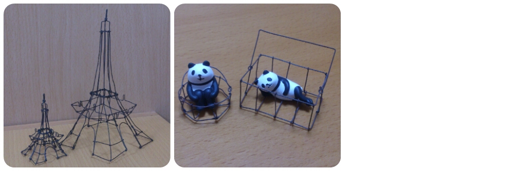 ストライクです、高めにストレートです( ´▽`)ラジオペンチをふたつ使って作りますこの趣味も好きなだけでヨレヨレしてますが...(笑)自己満足の世界です(*ノ∀`)エッフェル塔とカゴです。カゴにはパンダちゃんに入ってもらいました(笑)エッフェル塔に見えますかね...(´Д`;)私はエッフェル塔が好きで集めているので、このコもこっそり飾ろうと思います集中して作ってるとあまり考え事をしなくて済むので良いですねalbert000314さんアドバイスありがとうございます( ´ ▽ ` )ノ今は仕事で箱根です箱根の紅葉はまだ少し先かな...一緒に来たいなぁおっと!Σ(゚д゚;)ついつい考えちゃう(笑)箱根は思い出が多くてダメだ...(ノ_・,)次は何の趣味に没頭するか考えよう