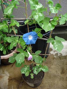 昨日のオリンピック女子ソフトボール上野由岐子投手、ホントにすごかった昼も夜も1日2回の延長試合を投げきったハラハラする試合でしたが、最後に勝ってくれたTVで見ているだけでも、疲れましたが上野投手の疲れ方はイカほど。しかも、今夜のアメリカとの金メダル奪い合い決勝戦でも投げて欲しいと言われているとか今夜も夜7時半から に かじりつきです。さて、名前は忘れましたが青い朝顔も咲いています。この朝顔、咲いた時は青いけれど蕾の時や、しぼんだ後は赤いというのが、面白いです。(下の方に、赤くしぼんだ花が見えますが、昨日咲いた時は青でした)朝顔のバックにある黒い入れもの、見えますでしょうか本来はペールゴミ箱ですが昨日降った雨をこれで受けるとで満タンになっていましたつまり、昨日の降水量は80cm以上いいえ実は、我が家、車庫の屋根の雨を これで受ける仕組みにしているのです。(変わった細工はしていません。車庫の屋根の雨どい掃除をしたときにパッキングが弱ってしまって、1箇所から水が漏れ落ちるようになったのを下で受けているだけです。)昨日の急な雨、3時間くらいで このペール容器が満タンになりました。今夜も集中して降るという予報です。また雨が溜まるはず。ソナタ、昼は日射しが苦手、夕方になると蚊が多くなるので外に出るのは嫌今朝のうちに、このペールを空にしないと水に液体肥料を加えて、植木の水遣りに使い切りました。