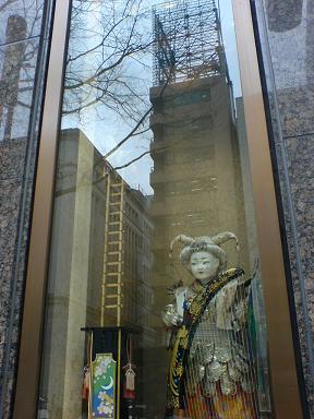 まず、一番大きなお人形、この人形の目が動き始めます。音楽もなかなか素敵!からくり人形は5分くらい動いているのにガラスに反射するし、見づらくてごめんなさい!桜のところが七宝です。下からオレンジの衣装の童子がせりあがります。13時半、15時半、17時半、19時半の一日4回チャンスがありますよ。歌舞伎のついでに観るのは難しい。昼の部を観ていたら、最初の2回は観られない。夜の部を観ていたら、後の2回に間に合わない。昼だけ観て帰るなら、観られるけれど、17時半までどこかで時間をつぶさなくてはなりません。歌舞伎以外に銀座に来た日のお楽しみ♪(2009-04-01)
