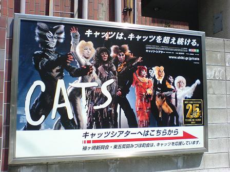 初めての2階席は思ったより猫がたくさん近くを通り、なかなか良かったです。特にマキャビティが超美形でギリシャ神話の彫像みたい!ウットリ♪ここの位置からだと、プレイボーイのタガーの歌の時に女の子の猫がみんなはべっているときのおちびさんの猫のシラバブの様子が良く見えました。俳優さんの個性が出ているこのシーンがスキ♪今日のバブ、南さんは「私もそばに行きたいな」と思いつつ恥ずかしいのと、自信がないのとでスリッパをもてあそびながらじっと、タガーやおねえさん猫たちを見つめてました。少しずつ、少しずつ、前に出て行ってやっと加われそうになったら、おしまいになっちゃった!だから、鉄道猫スキンブルシャンクスのところでタガーの上に乗る時、タガーがふざけると、困ったというよりじゃれあえて嬉しい!恋する女の子って感じがして、とっても可愛かった! キャストに奇跡が起こったというのはね、私が最初にキャッツを観た札幌でおなじみの俳優さんが4人もキャストにいたこと。あの時のタガーのまま、今もアイドルしてる荒川務さん。大きく腰を振るセクシーなタガーの芝さんは今日はリーダー役のマンカストラップ。あの日、デュトロノミーだった村さんがバストファージョーンズなどで美声を聴かせてくれました。そして私自身も聴きたかったし、初めてキャッツを観るAKKOさんに聴かせてあげたかった早水小夜子さん。AKKOさん、メモリーを歌う早水さんに涙をぬぐっていました。お気に入りのミストと、一度観たかった有永さんのディミータも28日から交替になり、うまい具合に観られました。有永さんは美しいし、気が強いディミータらしくキッとしているし歌も上手だし、ディミータにピッタリ!もう大満足!最後のキャッツ、心ゆくまで楽しめました。今日のカーテンコール、千秋楽の幕を囲み、猫たちが並んで手を振った後も何度も何度も繰り返されました。これで高倉さんのタント、高島田さんのジェニ、范虎のギルが揃ったらワタシ的には言うことなしですが、そこまで贅沢は申しません。十分です!たくさんのワクワクをありがとう!CATS!初めて観た日から、ミュージカルのトリコにしてくれたCATSに感謝でいっぱい♪観たことない人もがっかりしないでね。観てない人は幸せよ♪これから初めて観る楽しみが待っているから。たくさん良い作品があっても、やはり原点、特別です。横浜のキャッツシアターは1階席のみだそう。どんなシアターになるんでしょ。始まってすぐはチケット完売でしょうから落ち着いた頃に横浜に詳しいカプちゃんに案内してもらお! 去りがたく、皆、心とカメラにその姿を残すのでした♪さようなら、五反田のキャッツシアター!ありがとう!24匹のジェリクルキャッツたち!