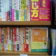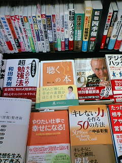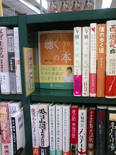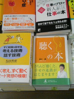 1・先々月にお仕事で知り合った、バリバリのキャリアウーマンの女性。とても素敵な方。彼女が六本木の書店で本を見つけて買ってくれた。「内容拝見して、不覚にも涙してしまいました。周囲の人に対する温かい気持ちを忘れていなかったかな、と、色々わが身を振り返ってしまいました。」こんな感想を、わざわざメールしてくれた。こういうことが温かい気持ちなのよ!忘れてないわ!あなたは十分やっている!都会で、いっしょうけんめい働いている若いみなさん。聴くの本、でしばしの「ほっ」とする時間をお過ごし下さい。だからみなさんの目に留まるよう、普及しなくちゃ!版元に専任営業社員はいません。担当者さんも次の仕事に入り連絡が途絶えがちです。藤田、仕掛け側、ひとりぼっちです。もちろん、全国の応援してくれるたくさんの人はいます、それはしっかり認識しています!ではいいですか?いきますよ、助けてください。書店にてあなたさまの手で「「聴く」の本」を平積み移動お願いいたします。まず、こんなふうに。既に売れていてしばらくPRしなくていいでしょう?という本(この場合、「7つの習慣」)の上に置かせていただく。上に載せるっていうんじゃなくて。力を分けていただく、そうそう充電機にのっけるみたいな。ありがとう、コーヴィーさん!さらに、こんなふうに、某横浜でも実行中!Hさん、ありがとう!