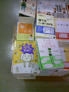 おととい、寝ようと思ってたら、編集者さんから情報がきた。「啓文堂府中店には現在店舗の中ほどの「エンド台」(棚前より全然いい場所)に平積みしているそうです。(店員さんにTELで確認)→グレードが上がったのです。 いま現在、全体の売り上げは順調です。ただし地区の偏りが東京のみというのが特徴です。 紀伊國屋書店データでは渋谷店・横浜店・梅田本店(大阪)・名古屋・新潟が弱いです。 どちらも横浜・大阪・名古屋・新潟に数字が欲しいところです。」ううううれしい。毎日見張りにひそかに通っている価値があった!さっそく行ってきましたよ!(授乳中の私に代わって夫が(笑))紀伊国屋新宿店のほうは、こんな感じです。コーナーが変わりましたね。しかも、棚の中に埋もれてる。およそ全国の書棚ではこんなふうになってることでしょう。Tさまの足で稼いだ情報ですがこの1冊は、平積み化より手っ取り早く、T様によってお買い上げに!どうもありがとうございました。