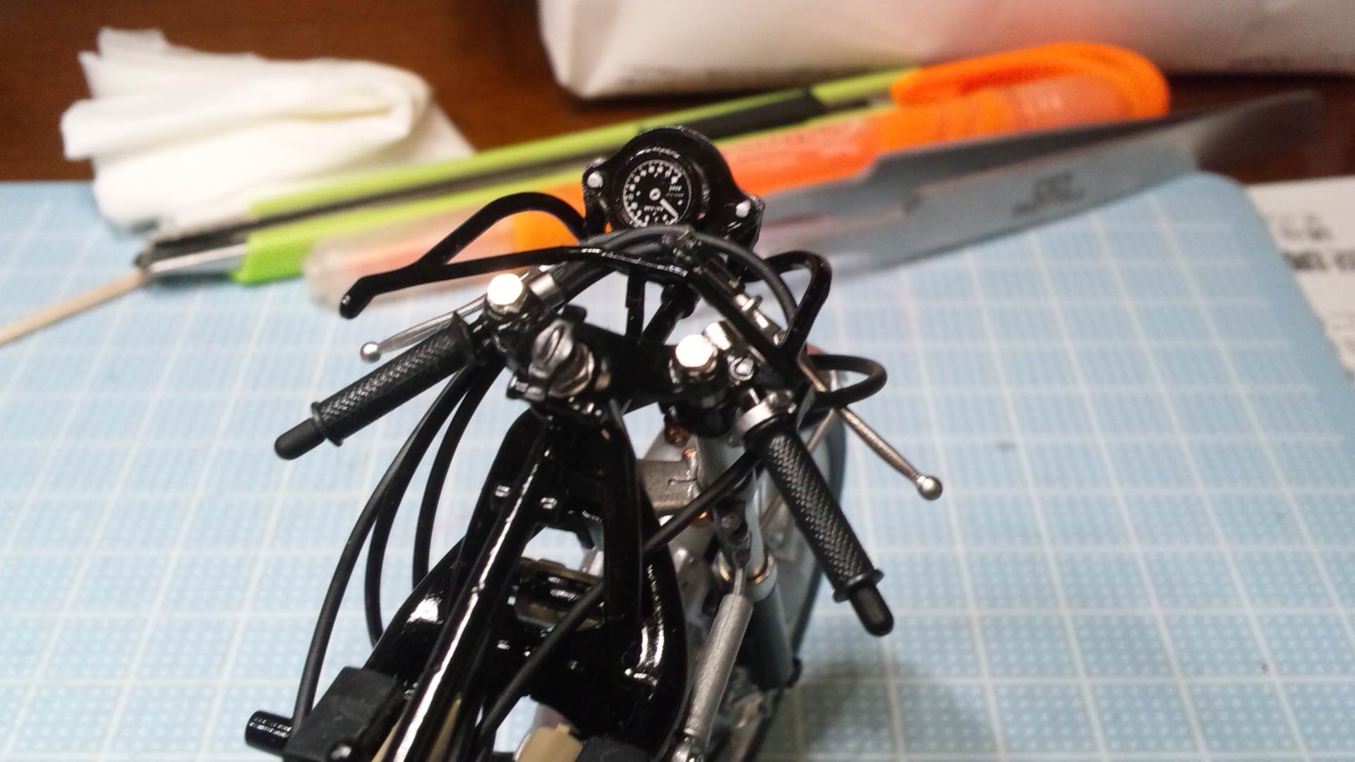 ハンドル回りも私には初体験。艶消し・半光沢・艶ありの各種黒を塗り分け、シルバー部分はクレオスの