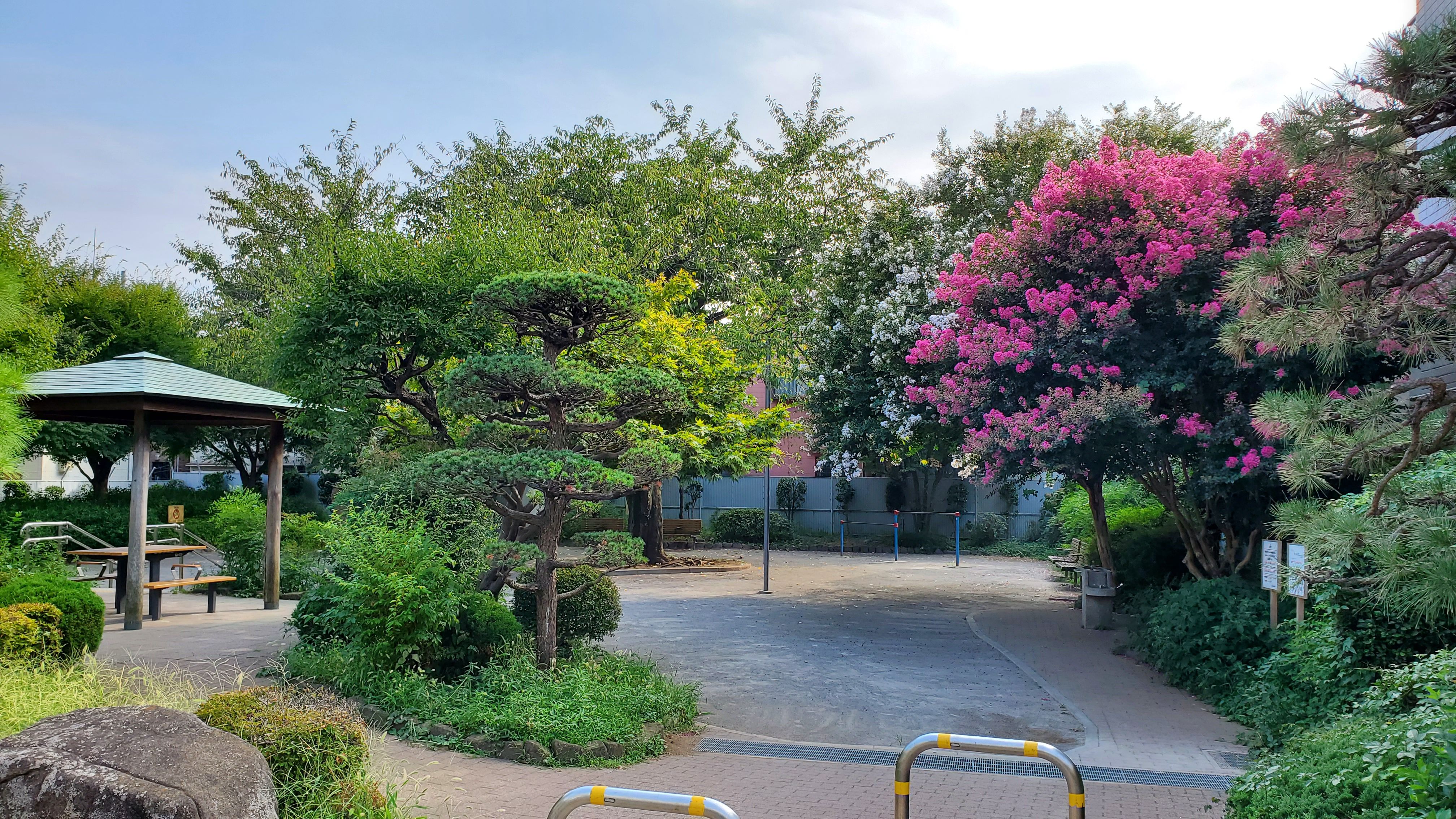 もうずいぶん前、8月31日の散歩…… 大井鹿島公園……光福寺を出てJRを越えようと少し東へ。赤い花、白い花と緑が心を和ませてくれる公園でした。なんで「鹿島」なんだと思いきや、近くに鹿島神社があるからでしょう。 線路わきに出ましたが、これを越さないとならないのでしばらく行くと…… 大井鹿島橋……左は線路だけど右を見たら…… 下に道路……下りてから、折り返してまたさらに下りますが歩道があって良かった~ ガード下通過……この道を直進すれば大井競馬場はさほど遠くはありません。競馬やらないから行きませんが…… 最初の交差点で発見……信号待ちをしながら「裏口みたいだ」と考えて… 先に進んだら鳥居が見えたのでこちらから…… 行き交う車が後を絶たないから路上撮影は危険でした。「危ないからやめて~」と連れ合いに怒られます。 しながわ百景…… なぜか二宮尊徳先生像……焚き木を背負って勉学に励む姿は貧しかったのかと思いきや、比較的裕福な農家の長男とのこと。「尊徳」を「そんとく」って読んじゃうけど、「たかのり」が正しいんだよね~ 社号碑……九頭龍権現水神社 社号碑の脇に手水盤……ちょこんと乗っているおカエル様が可愛かった。アップでも撮ったけどボケてたからボツ。 鳥居をくぐって振り返るとこんな感じ…… 三角形をした境内……金網に囲まれた「水神池」があって、その向こうに「水神社」 水神池……この地に湧き出していた地下水は、そばに柳の木があったことから江戸時代より「柳の清水」として知られ、村人の飲用や水田耕作に利用していたと。 今は枯れちゃったみたい。 奥に進むと右に手水舎……突き当りに水神社。 水は出しっぱなしだったかしら? センサーなかったよな~ 振り返るとこんな感じ……こちらから向かうのが正しいです。 水神社……日照りの時はここで雨乞いをしたんでしょうが、火山岩のような石はどこから持ってきたのかしら。 水神社扁額……歯痛を止めるご利益もあったと。 明治以降、祭神は水葉乃女命(みずはのめのみこと)に変わったようですが、後で訪問した鹿島神社の境外末社だって。『…豊かな水の供給を願って、水神つまり九頭龍権現を祀ったのが始まりである。祀られた時代は貞享2年(1685年)……(品川区教委)』とありますから、最初に祀った権現が左の祠でしょう。中に「九頭龍大権現」の石碑が納められていました。 鳥居からV字の参道が設けられています。でもって、こちらで失礼した私でした。 蛇足:水の恵みを願って祀る九頭龍権現もあれば、洪水のときの荒れ狂う河川の様子を九頭の龍の姿に見立て、水の猛威を鎮めるために祀った九頭龍権現の石塔が入間川沿いにあるそうです。田畑を洪水から守ることを祈ってのことですが、どうぞ台風から守ってくださいませ。ちなみに九頭龍信仰のもとは、長野県の戸隠神社奥社(九頭龍社)にある九頭龍権現と考えられているそうです。いつかは行かれるかしら?《おまけ》 今日の空……9時43分 なんかはっきりしない天気だから、散歩は明日にしようかしら?