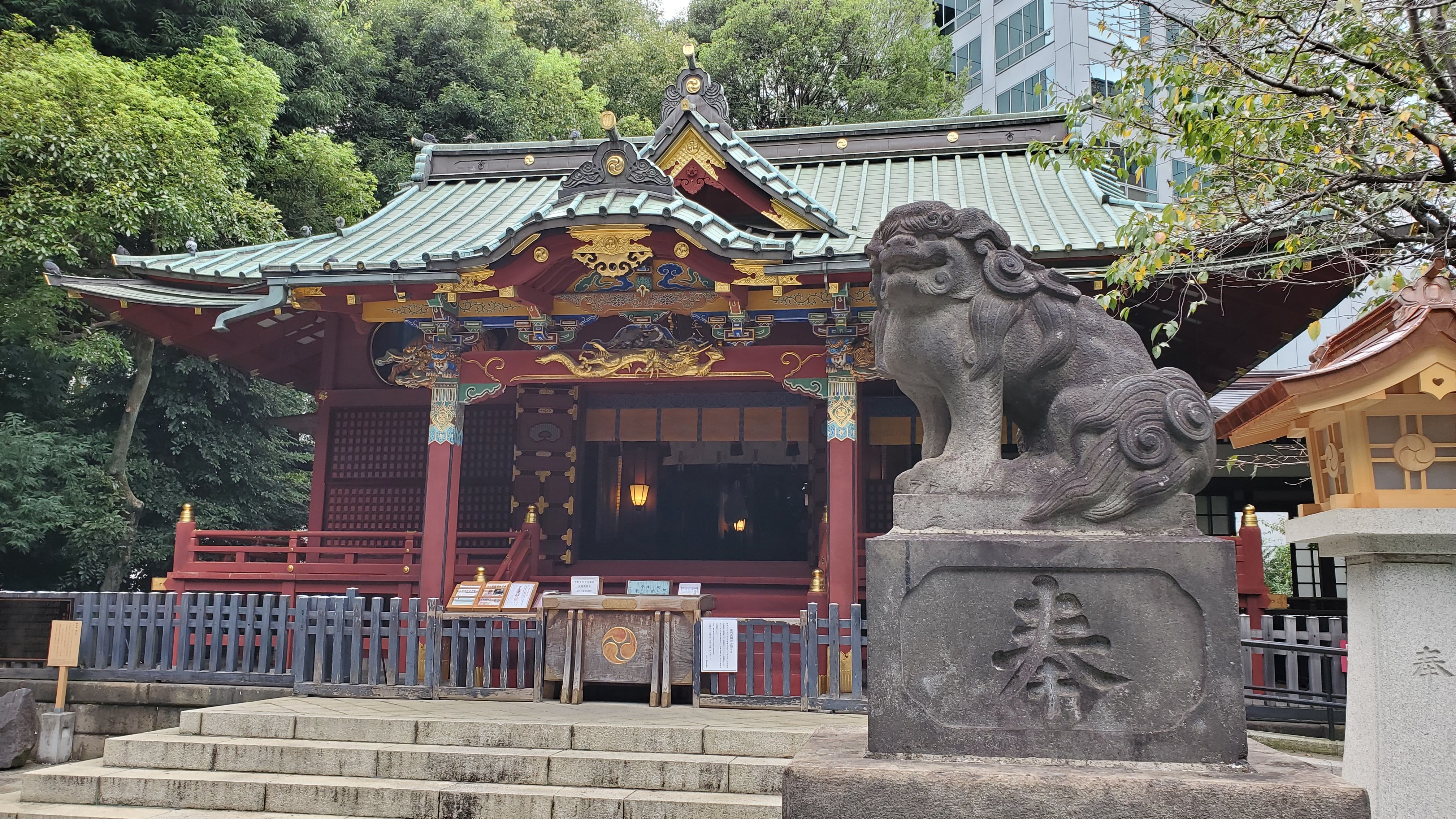 9月22日のブラブラ…… 東福寺山門を出て右にT字路……写真左すみに鳥居が見えますか? T字路突当りの右に神社…… 左には大鳥居……道路になっているけど、昔は参道だったはず。 ビルが立ち並んでいるけど、神輿庫らしきは境内の一部なんでしょう。 一之鳥居……大きい! 折角だから正面から……交差点内につき撮影要注意!! ついでに八幡通りから……仕事をしていた頃は幾度か通ったはずだけど、助手席で呑気にしていたからまったく気付いていなかった~ でもって、ふたたび境内入口まで戻り…… 金王八幡宮境内入口…… 立派な社号碑と二之鳥居……「神門」渋谷区指定有形文化財……通称を「赤門」と言い、建立年代は、「地子古跡寺社帳」によると明和6年(1769年)で、「門の額裏面刻銘」では享和元年(1801年)。若干の差はあるものの、幾度かの修理を経て江戸時代初期の建築様式をとどめて今日に至っています。都内でも代表的な建物の一つだと……そうでしょうね。 神門扁額…… 有形文化財の標識……渡り廊下が『附(つけたり)』だって。最近学習したものね。 配された燈籠と相まってより見栄えがします。 神門前右に「明治38年戦没記念碑」……凱旋軍人と彫られています。 凱旋軍人によって建立された日露戦争の記念碑で、揮毫(きごう)は乃木希典ですって。八雲氷川神社にも乃木希典揮毫の日露戦役紀念碑がありましたっけ。よく覚えていたもんだと自画自賛。忘れっぽくなったのに…… 境内に踏み込むと左に手水舎…… なぜか柱に『大ぞらに すむ月影も むら雲の かからぬ夜はは すくなかりけり』(明治天皇御製) コロナ禍に付き使用中止…… 境内の向こうは社務所…… 金王八幡宮社殿……『当八幡宮は、第73代堀河天皇の御代、寛治6年(1092年)正月15日鎮座いたしました。桓武天皇の曽孫である高望王の後裔で秩父別当平武基は源頼信による長元の乱(1028~1031年)において功を立て、軍用八旒(りょう)の旗を賜り、その内の日月二旒を秩父の妙見山(武甲山)に納め八幡宮と崇め奉りました。 武基の子武綱は、摘子重家と共に後三年の役(1083~1087年)の源義家の軍に300騎余を従え一番で参向し、仙北金沢の柵(秋田県仙北郡金沢)を攻略しました。その大功により名を河崎土佐守基家と賜り武蔵谷盛庄を賜りました。(「谷盛庄」は昨日の東福寺梵鐘で勉強しました。) 義家は、この勝利は基家の信奉する八幡神の加護なりと、基家が拝持する妙見山の日月旗を乞い求め、月旗をもってこの地に八幡宮を勧請しました。 重家の代となり禁裏の賊を退治したことにより堀河天皇より渋谷の姓を賜り、当八幡宮を中心に館を構え居城とし、渋谷氏は代々当八幡宮を氏族の鎮守と崇めました。これが渋谷の発祥ともいわれています。……』(同宮HPより) ということで今日はここまで……拝見する境内社・お堂が複数あったので第4話まで続きます。《おまけ》 今日は涼しかったので、シネマカフェで湯麺……暖まりました。 明日も明後日も雨らしい。台風による大きな被害が発生しませんように……