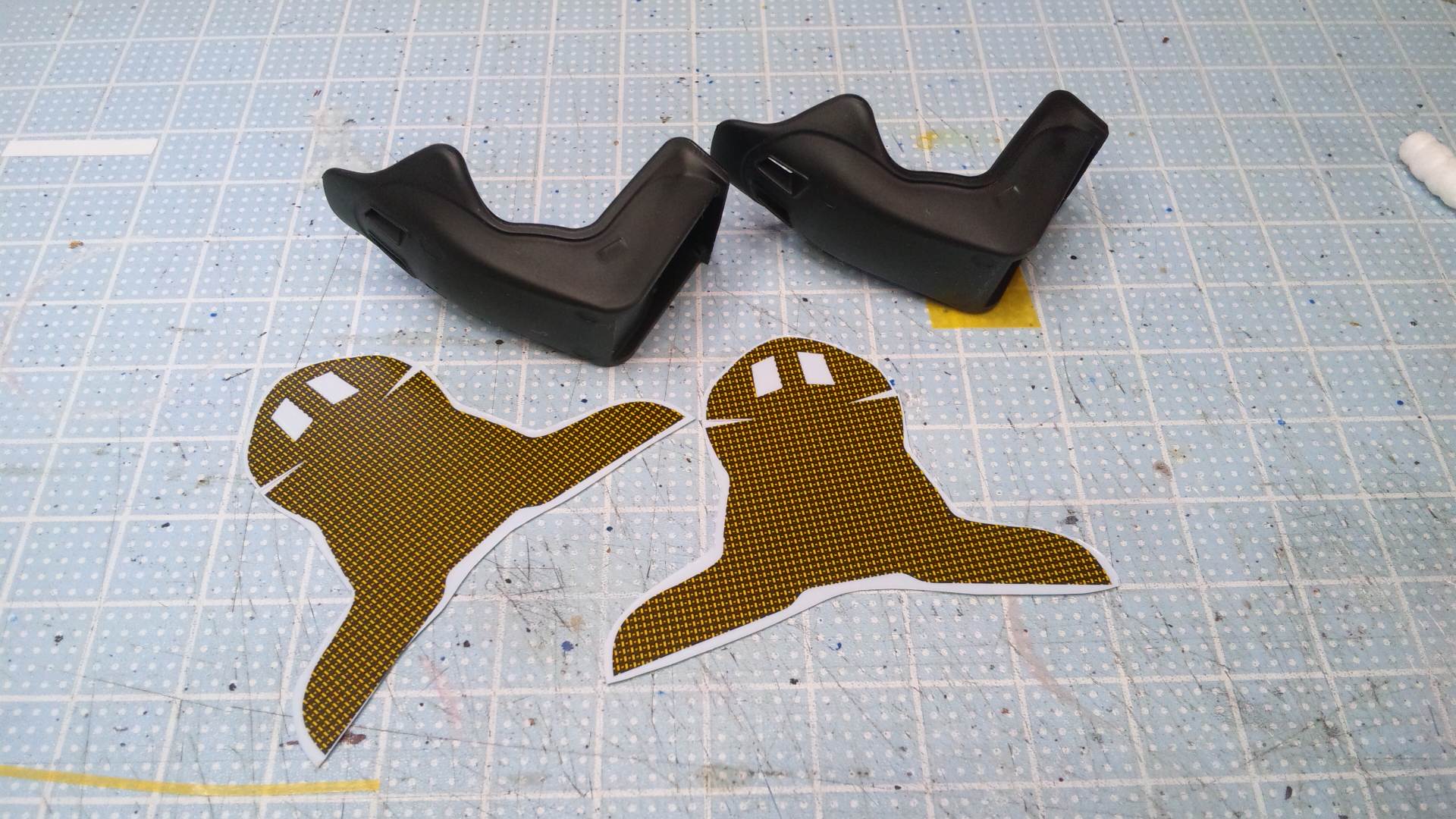 シートの後ろ側にはこんなの貼りなさい、とデカールがあります。軟化剤使用時の耐久性や、歪みの修正時対応力を確認するために貼ってみました。完成してもほとんど見えなくなるので、失敗してもかまいません。