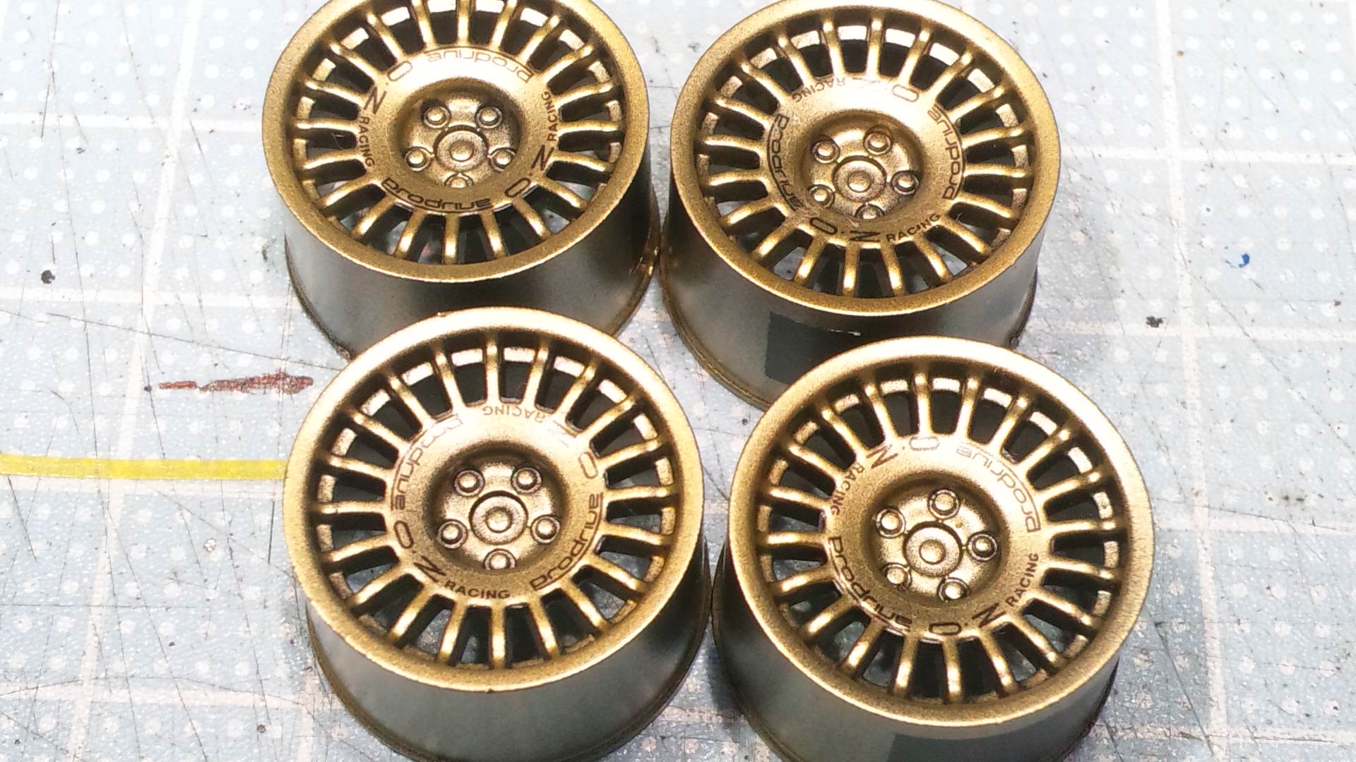 ついでにホイールの輪っか状デカールを貼りました。縁の透明部分は先に切っておくべきでしょうが、文字まで切りそうなので断念。はみ出した個所は、爪楊枝に軟化剤を付けてチョイチョイとフォロー。あらら……写真を見ると残ってます。現物は小さいので見落としました。