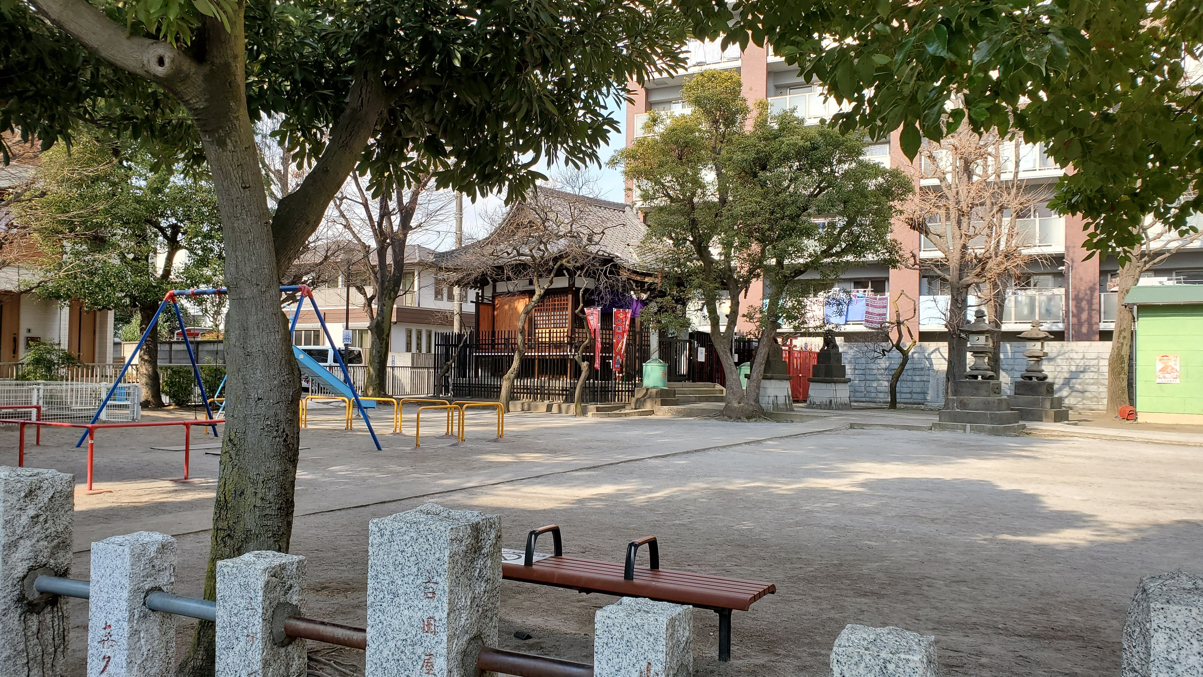 氷川神社……参道は真南に向いています。訪問時にはまったく気付いていませんでしたが、この日初めにお邪魔した新田神社と縁がある神社でした。左側大半が児童遊園で……誰も遊んでいませんが……