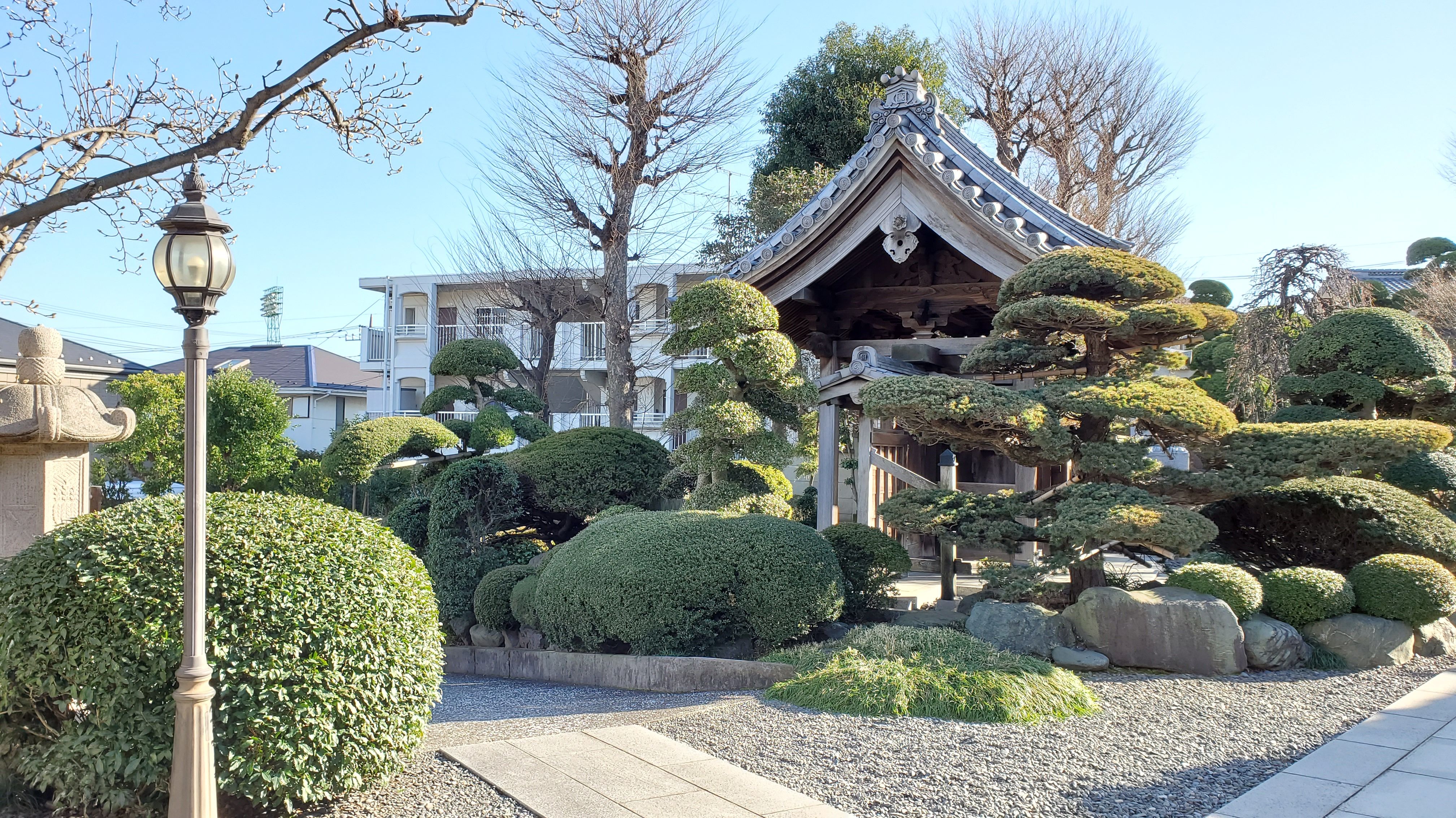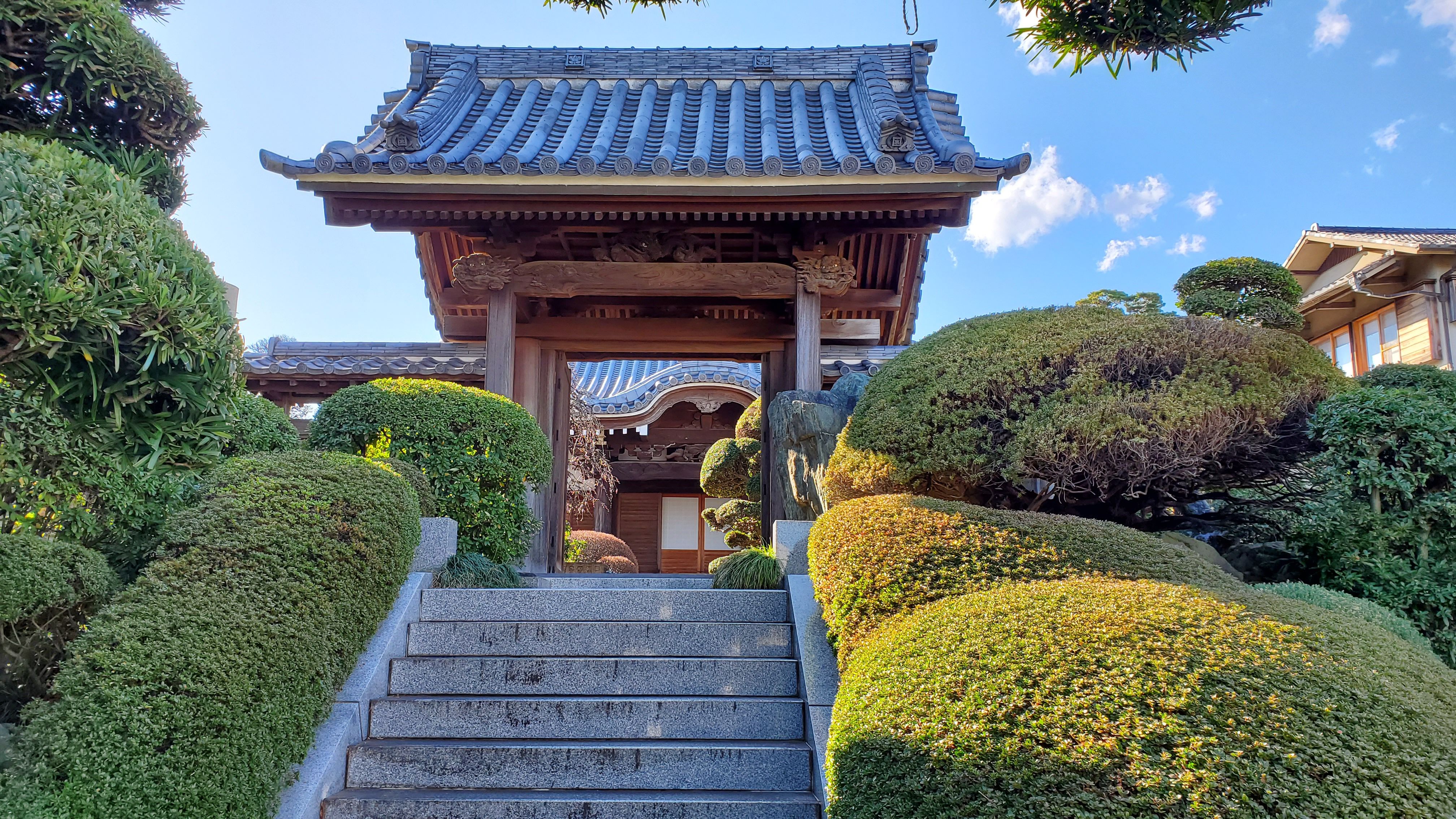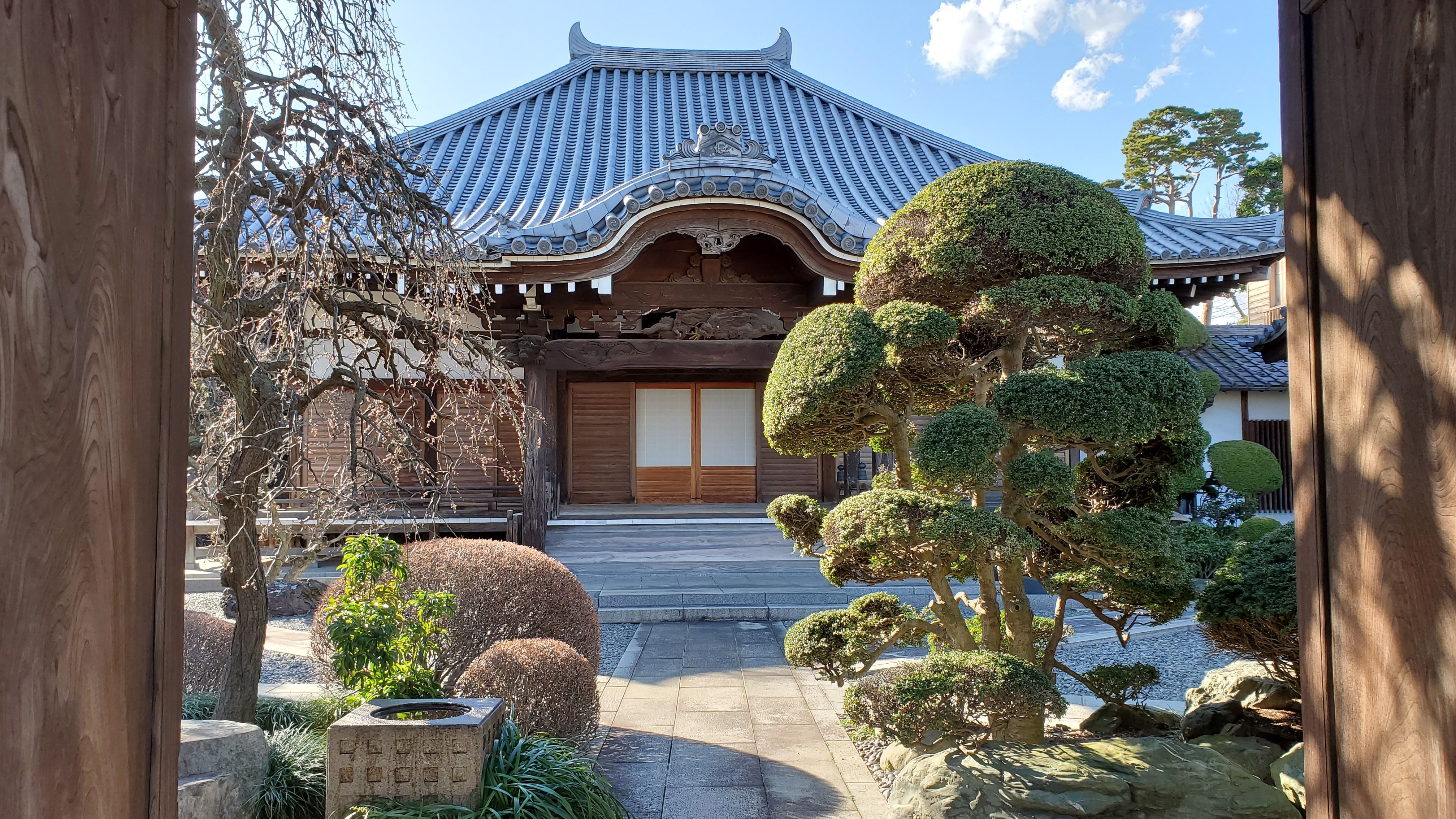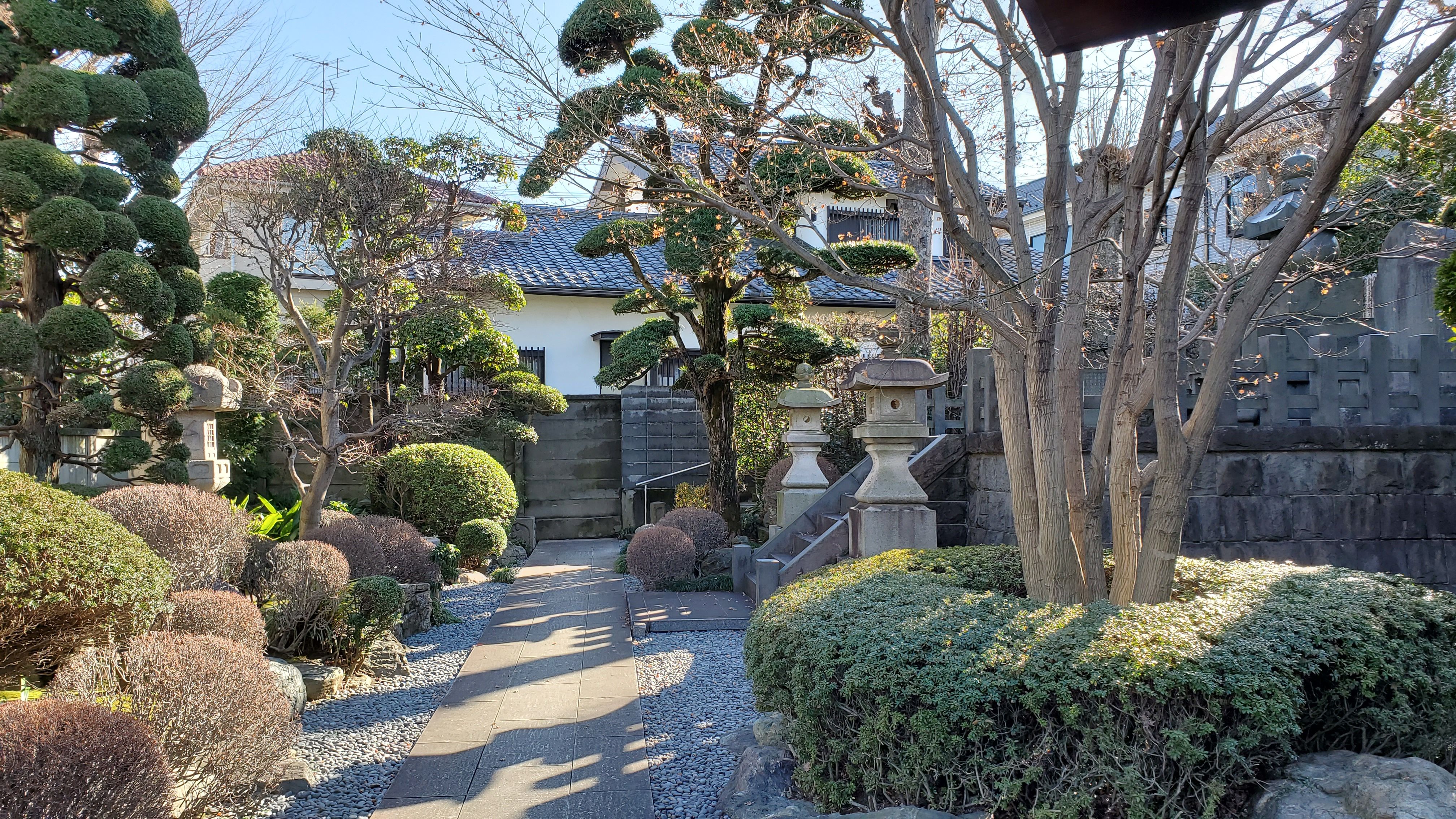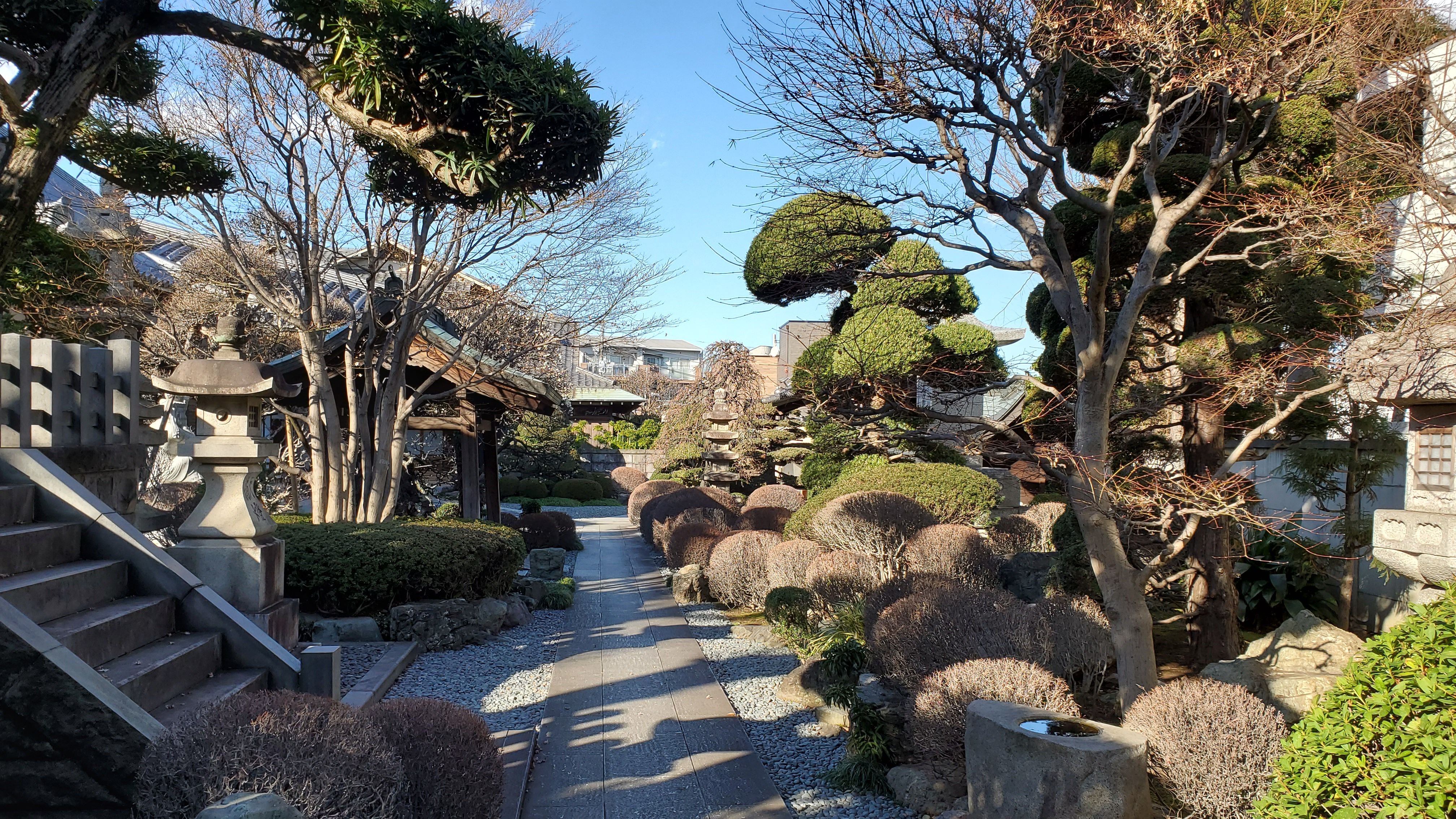奥から本堂前に向かって……きれいに丸く刈り込まれた植木たちはツツジかサツキでしょうか? ぜひ、春に再訪したい寺院です。