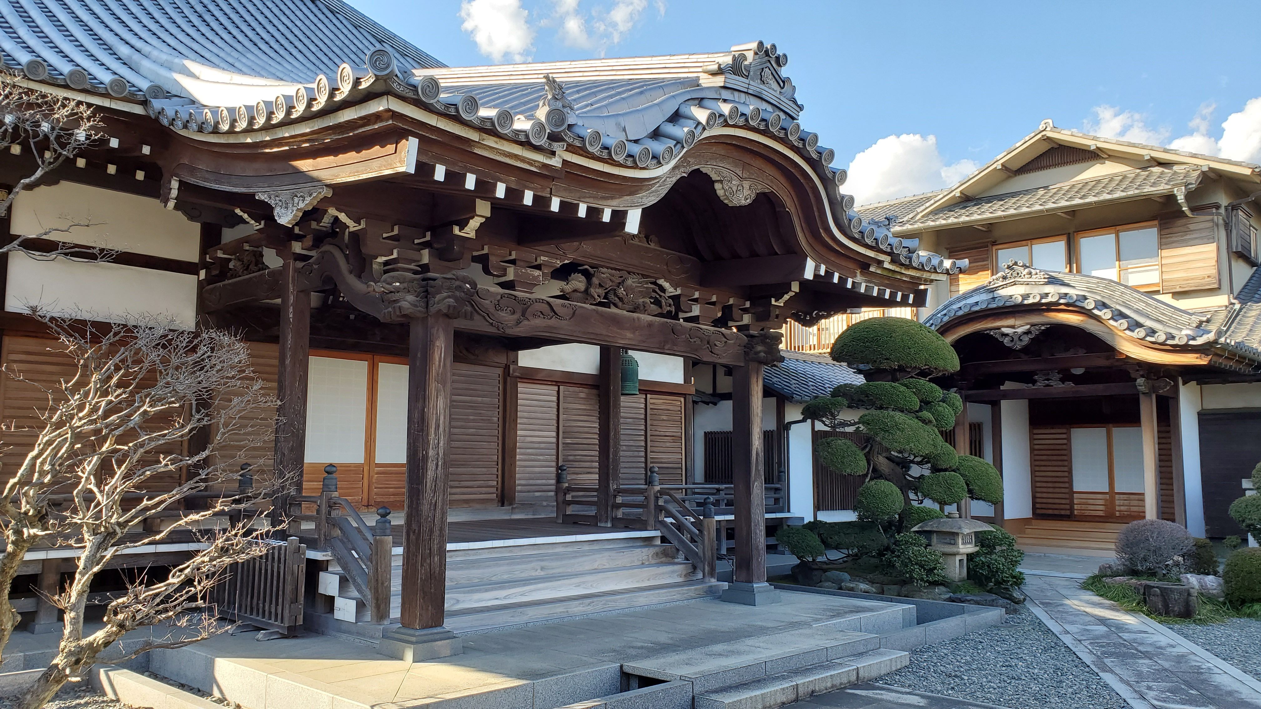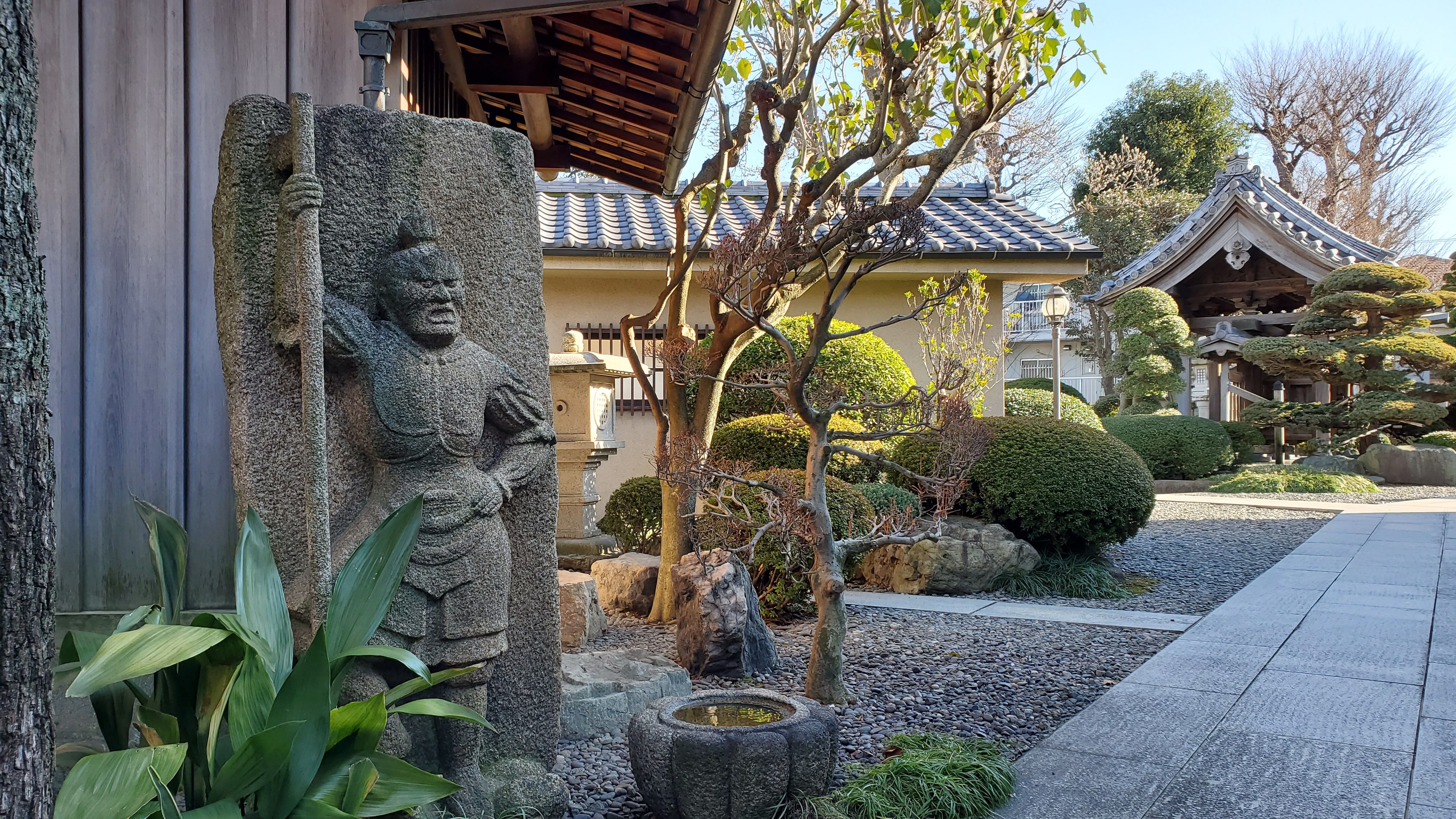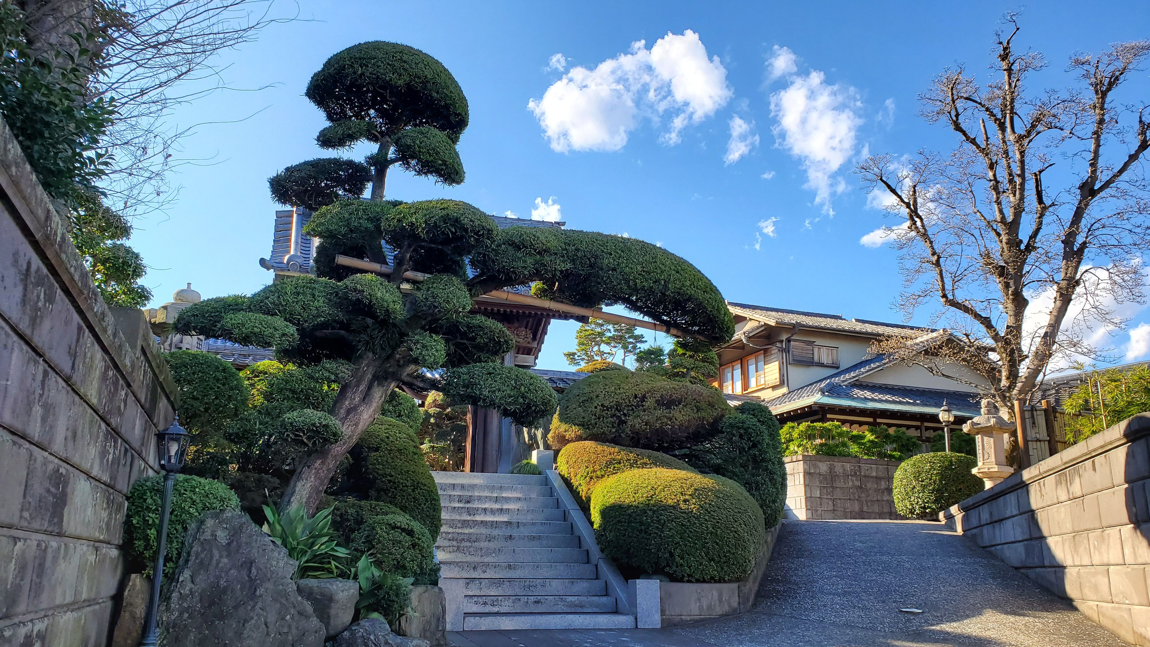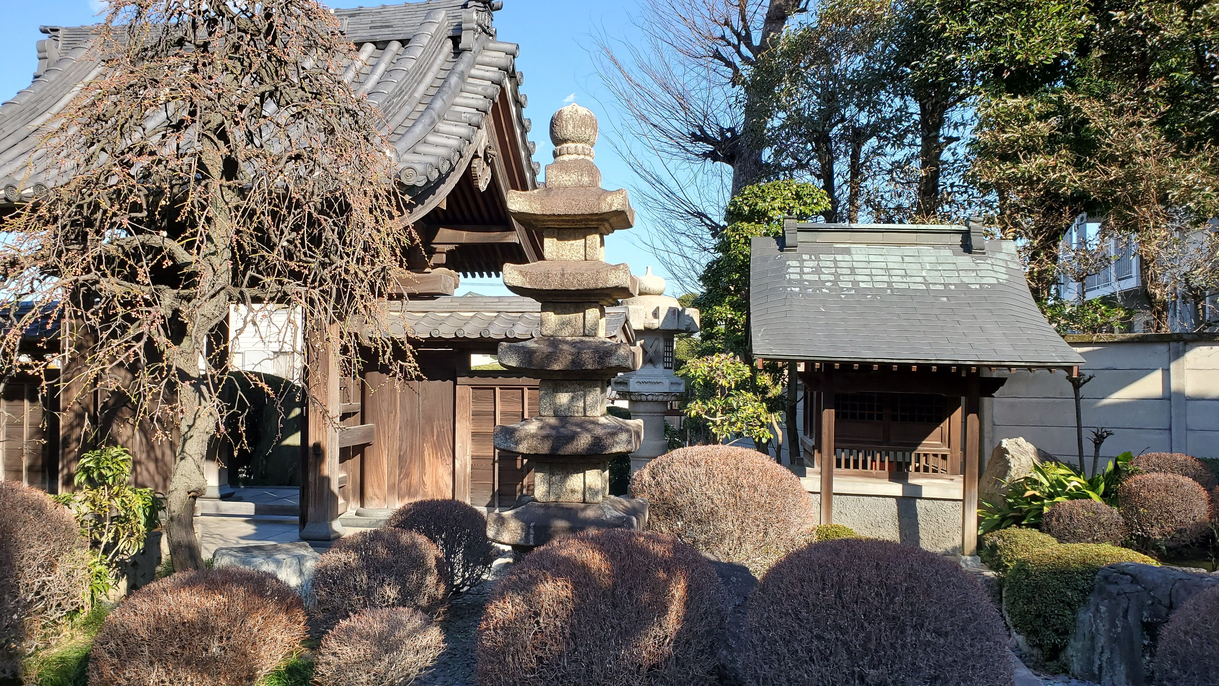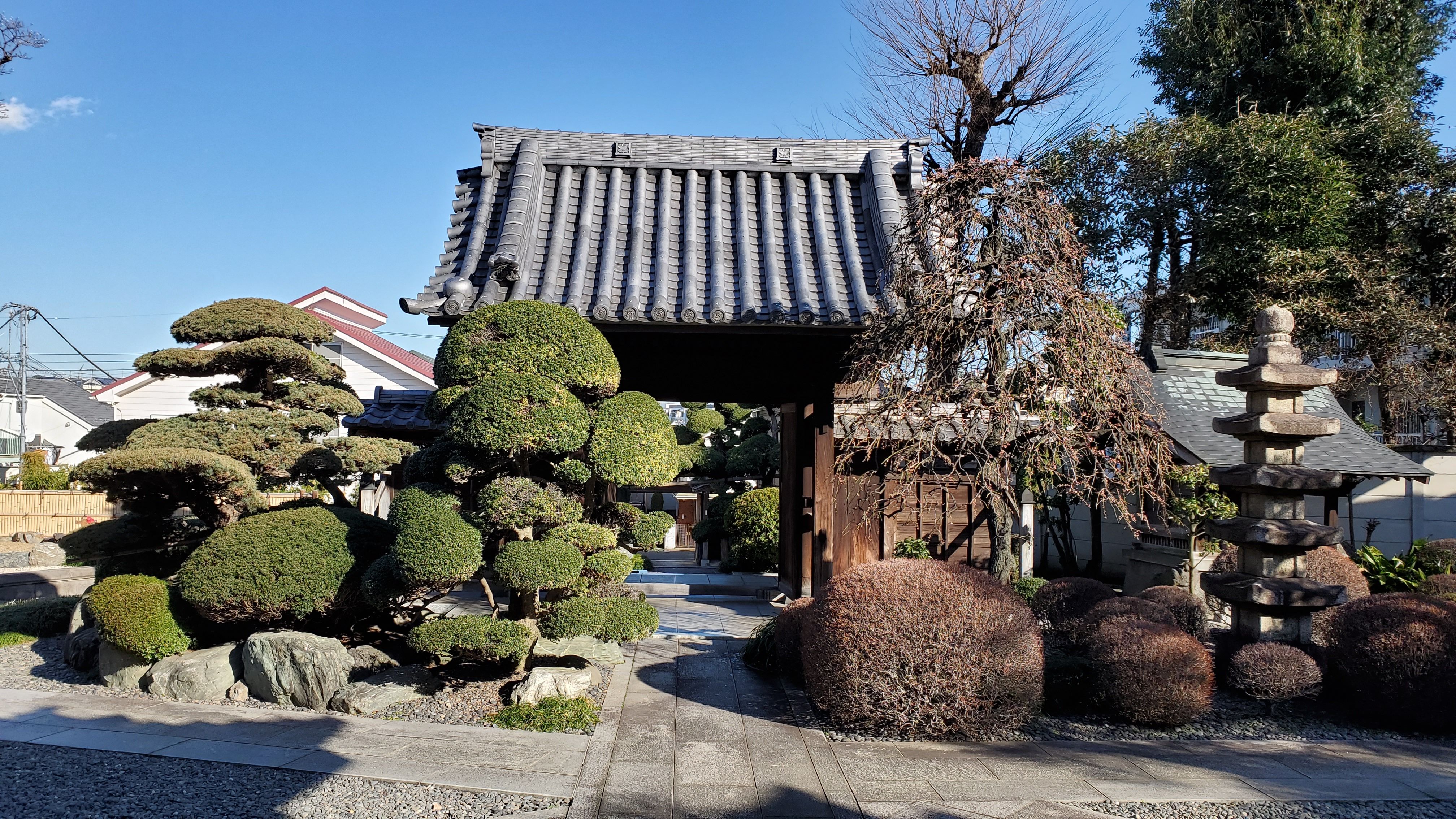 奥から本堂前に向かって……きれいに丸く刈り込まれた植木たちはツツジかサツキでしょうか? ぜひ、春に再訪したい寺院です。