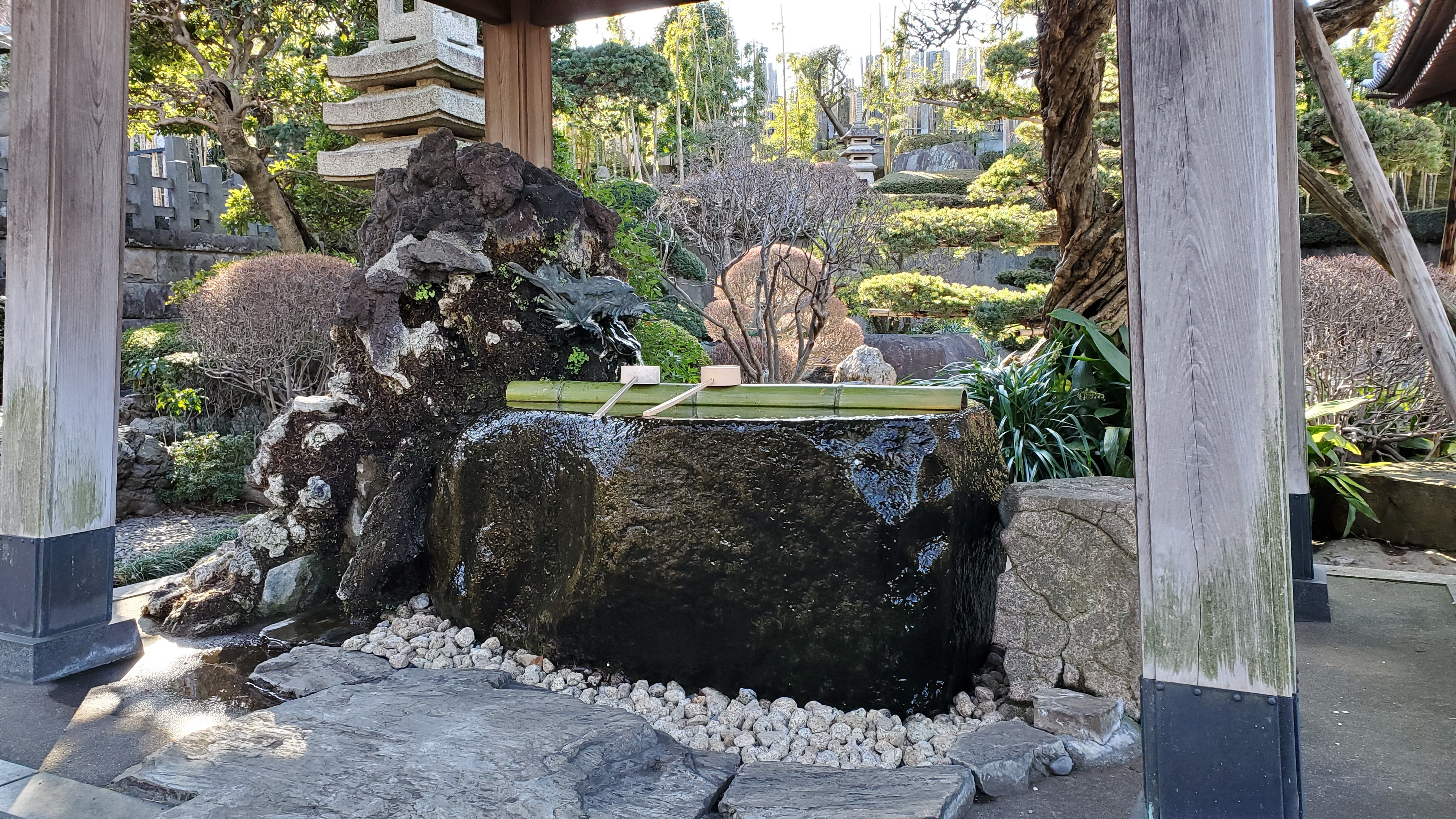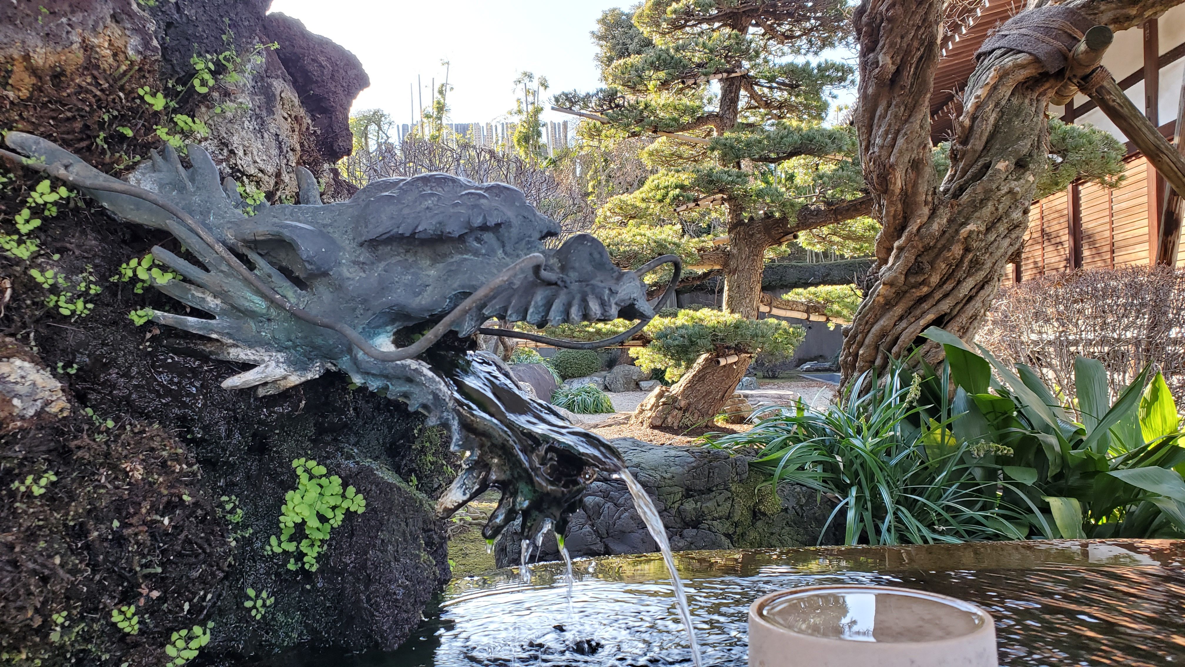 一枚岩をくりぬいた立派な手水舎……
