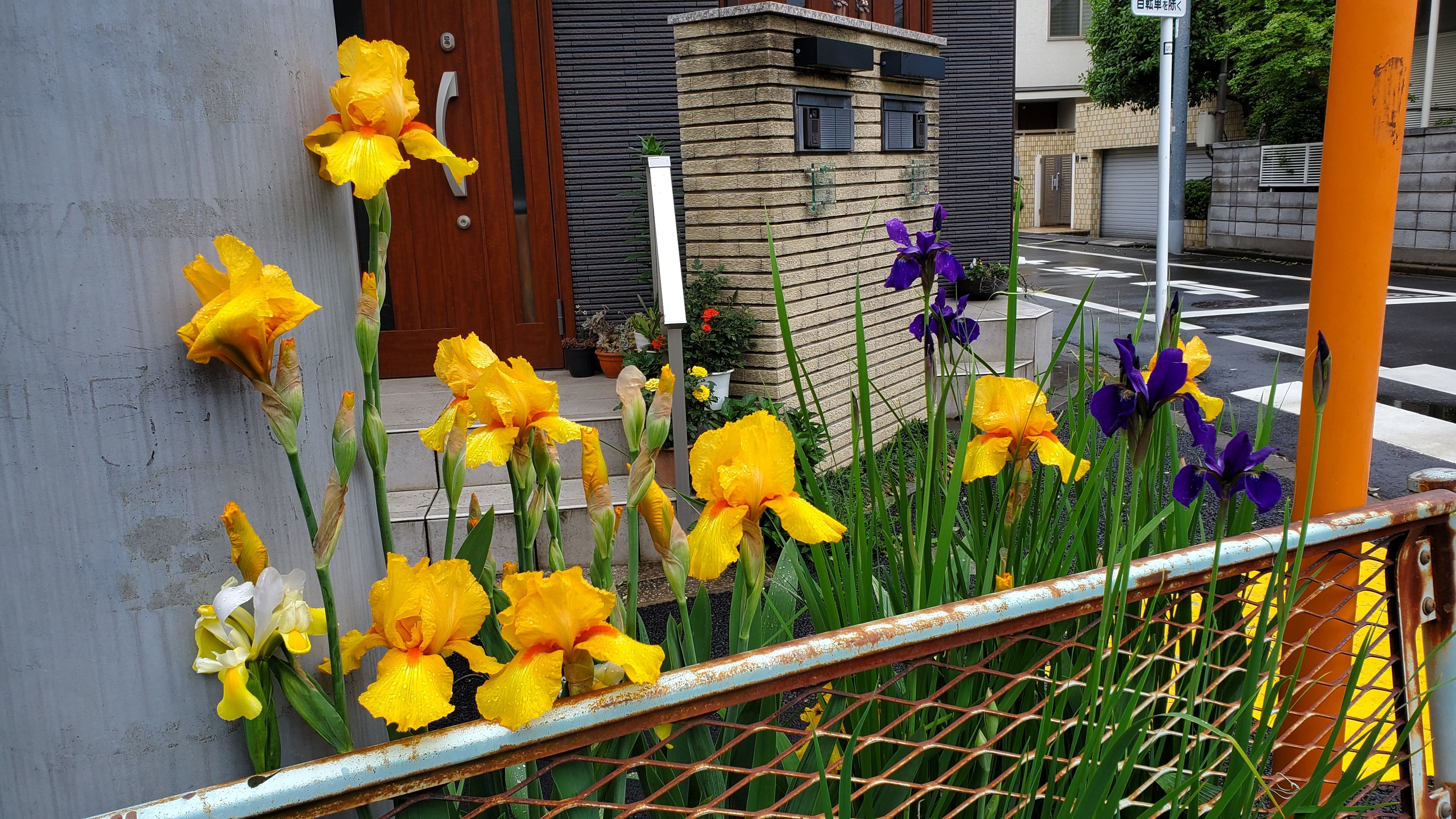 昨日から気になっていた 歩道脇に咲いている黄色いの……昨日は人が居たので断念。今朝も同じ方がいらっしゃったけどパチリ。「きれいですね~」と声をかけると「ありがとうございます」と返してくれた。前のお家の方が数年前に植えたそうで「ジャーマンアイリスって言うんです」と教えてくれた。紫のはショウブかカキツバタかアヤメか品種は聞かなかったけど、「長野(たぶん)から送ってもらったもの」だそうです。植え替えたり世話をするそうですが、多年草みたいです。