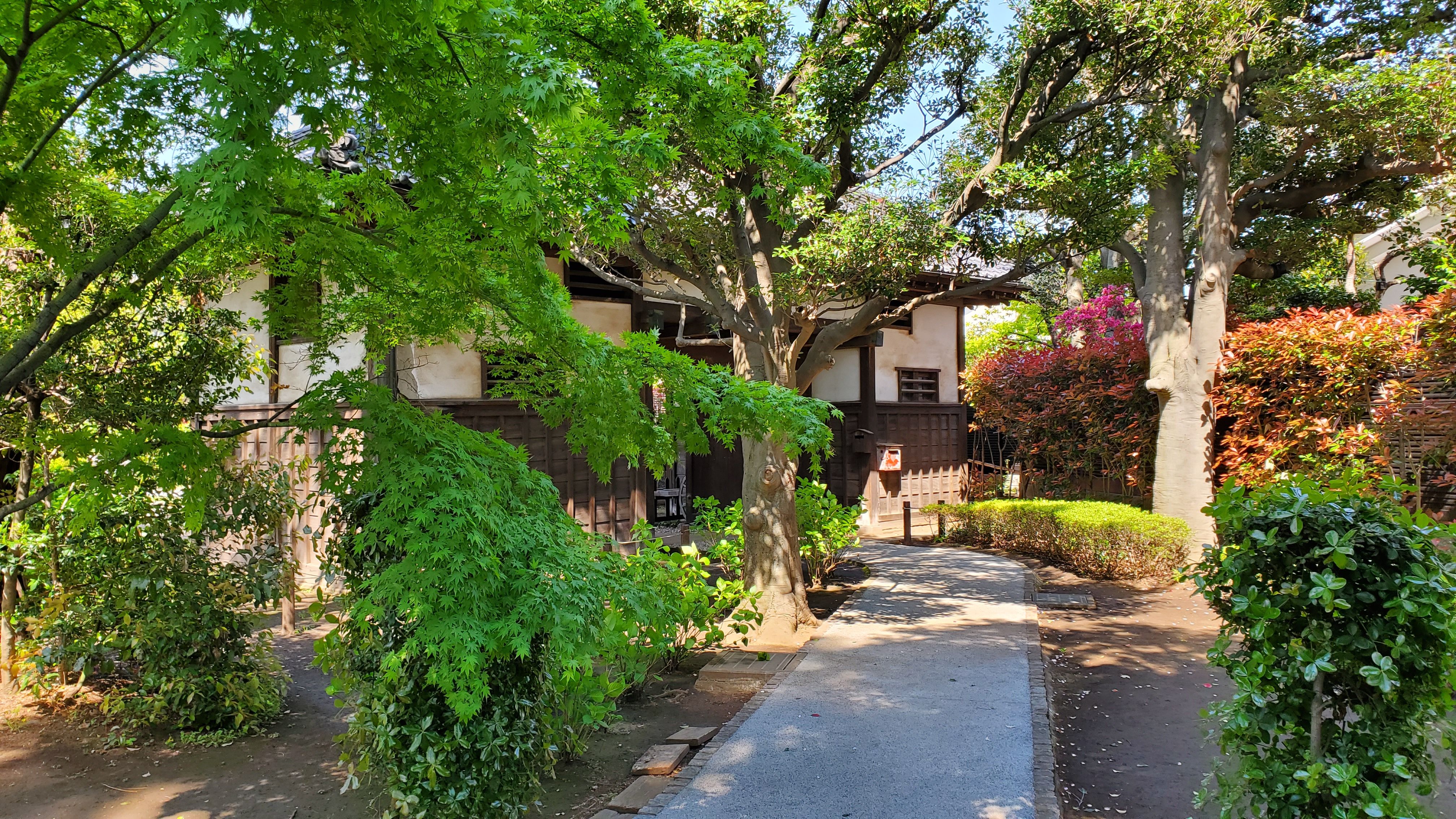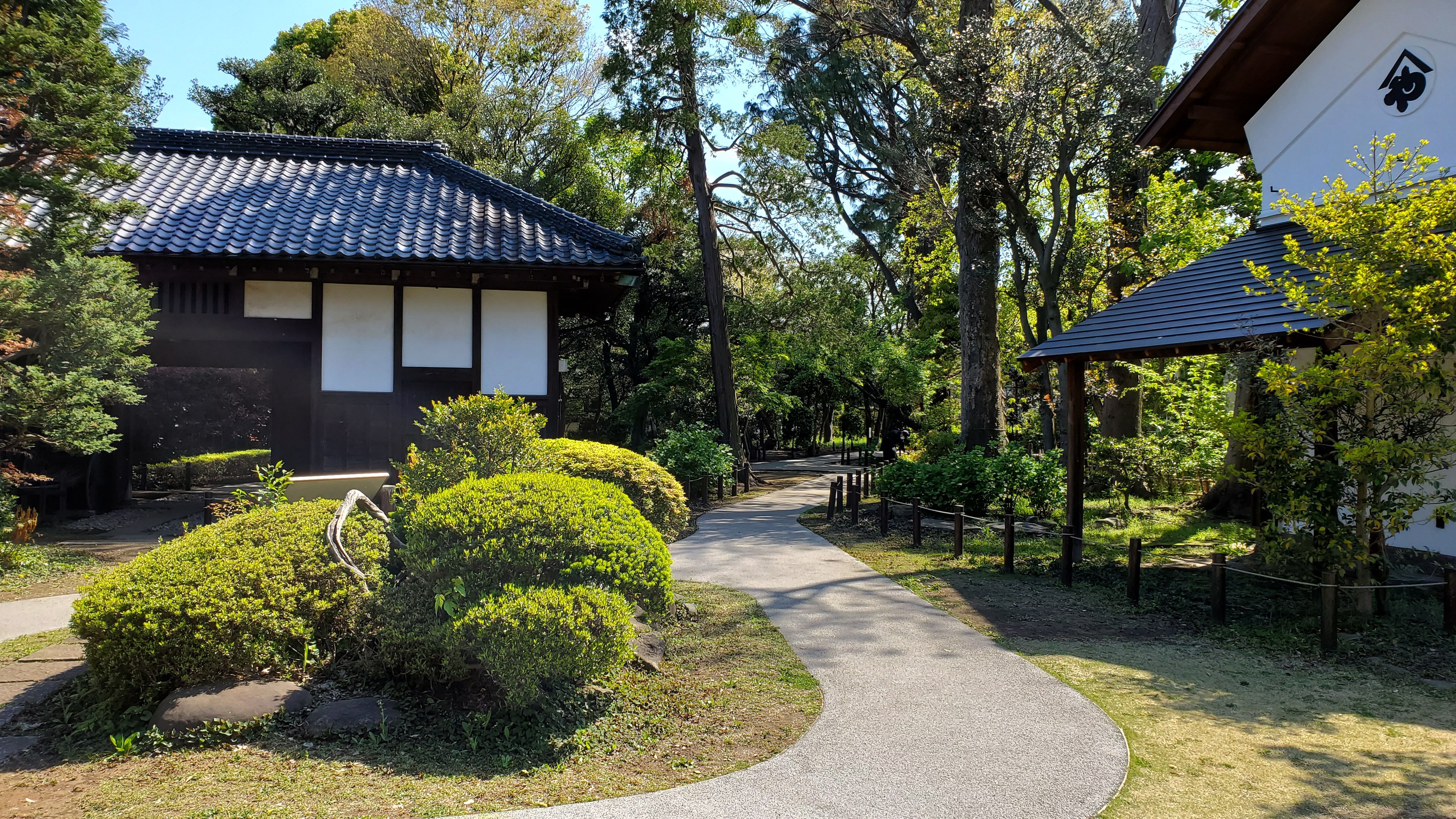 長屋門をくぐると現在の道路へと向かう園路……昔は畑だったのか?