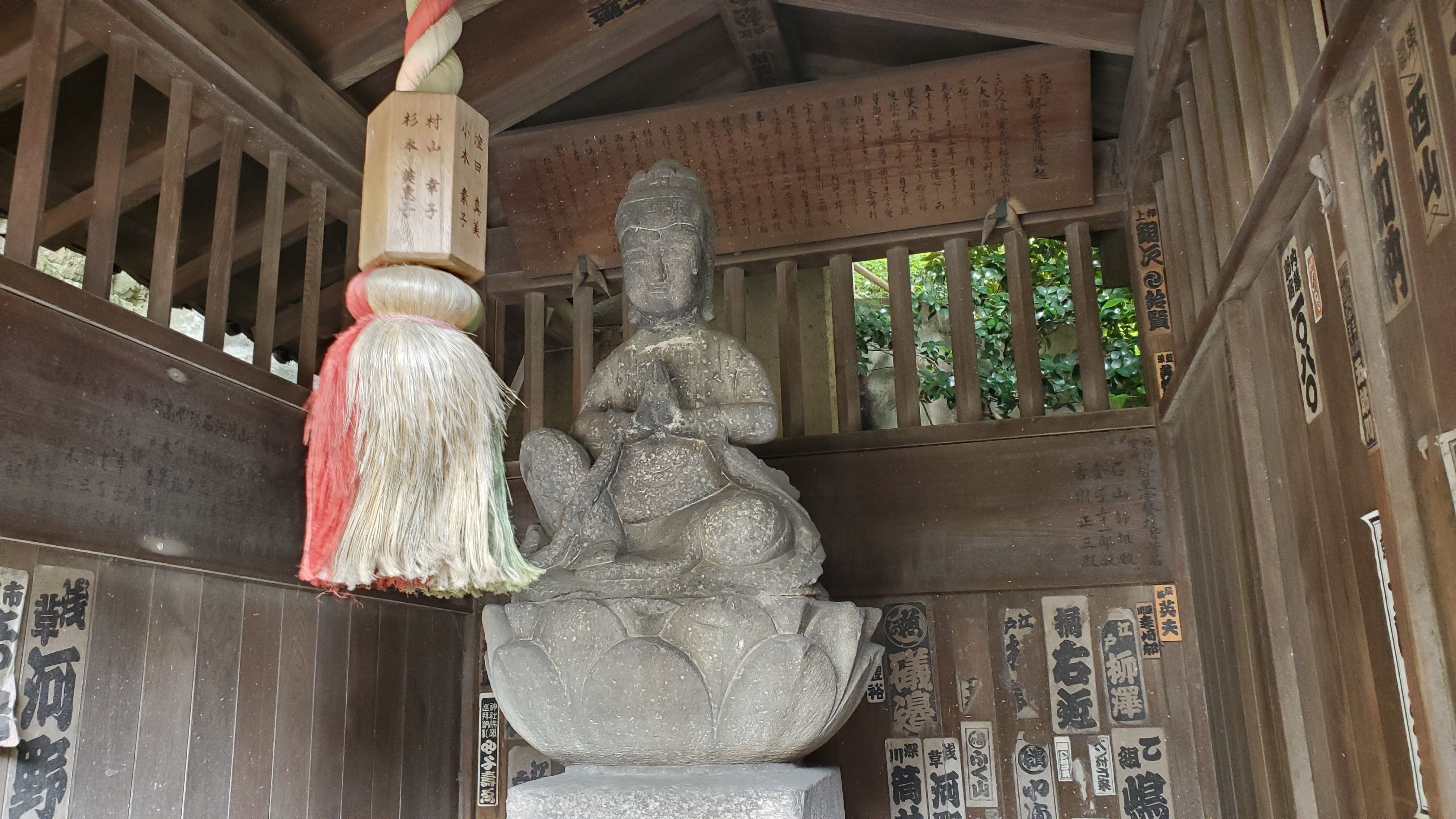 勢至菩薩石像……蓮華座の上で右ひざを立てて座っている。宝永元年(1704年)の物のようだが、大圓寺阿弥陀堂にも明和7年(1770年)に造られたとする勢至木像が安置されている。遠目だったが当日は拝見できたので、明日載せてみましょう。