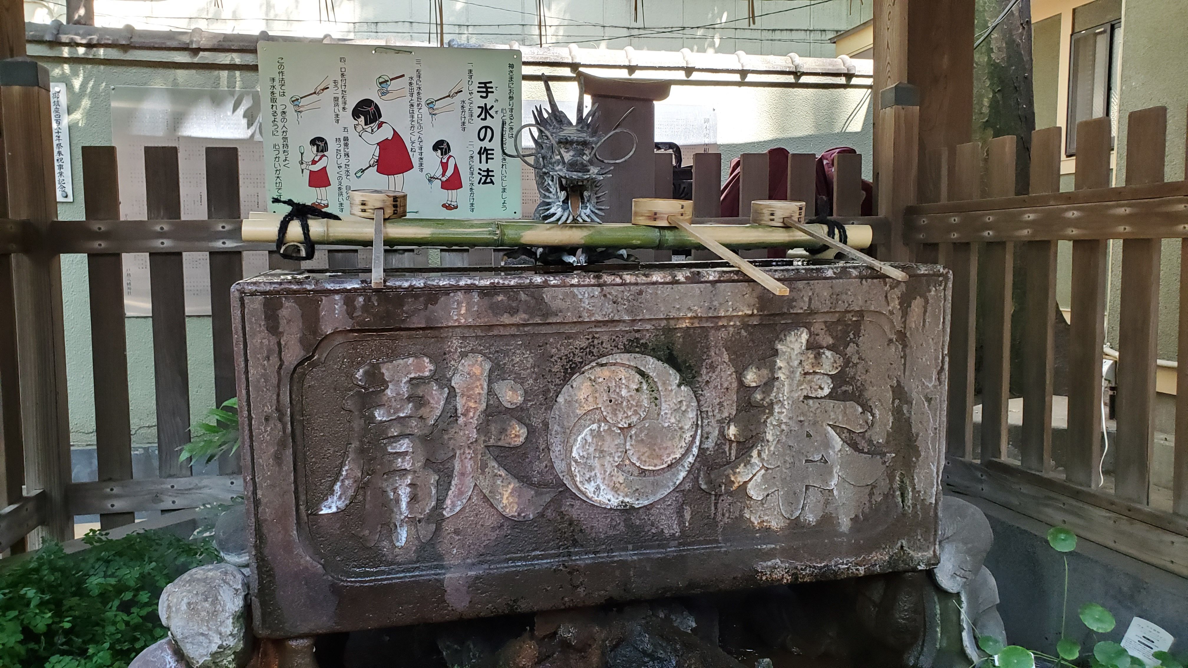 手水舎……『…アルコール消毒は勿論、石ケンにて丁寧に指先を中心に……』の貼り紙の下に石鹸が置かれていました。ルール違反かも知れませんが、私は手水はご容赦願いました。