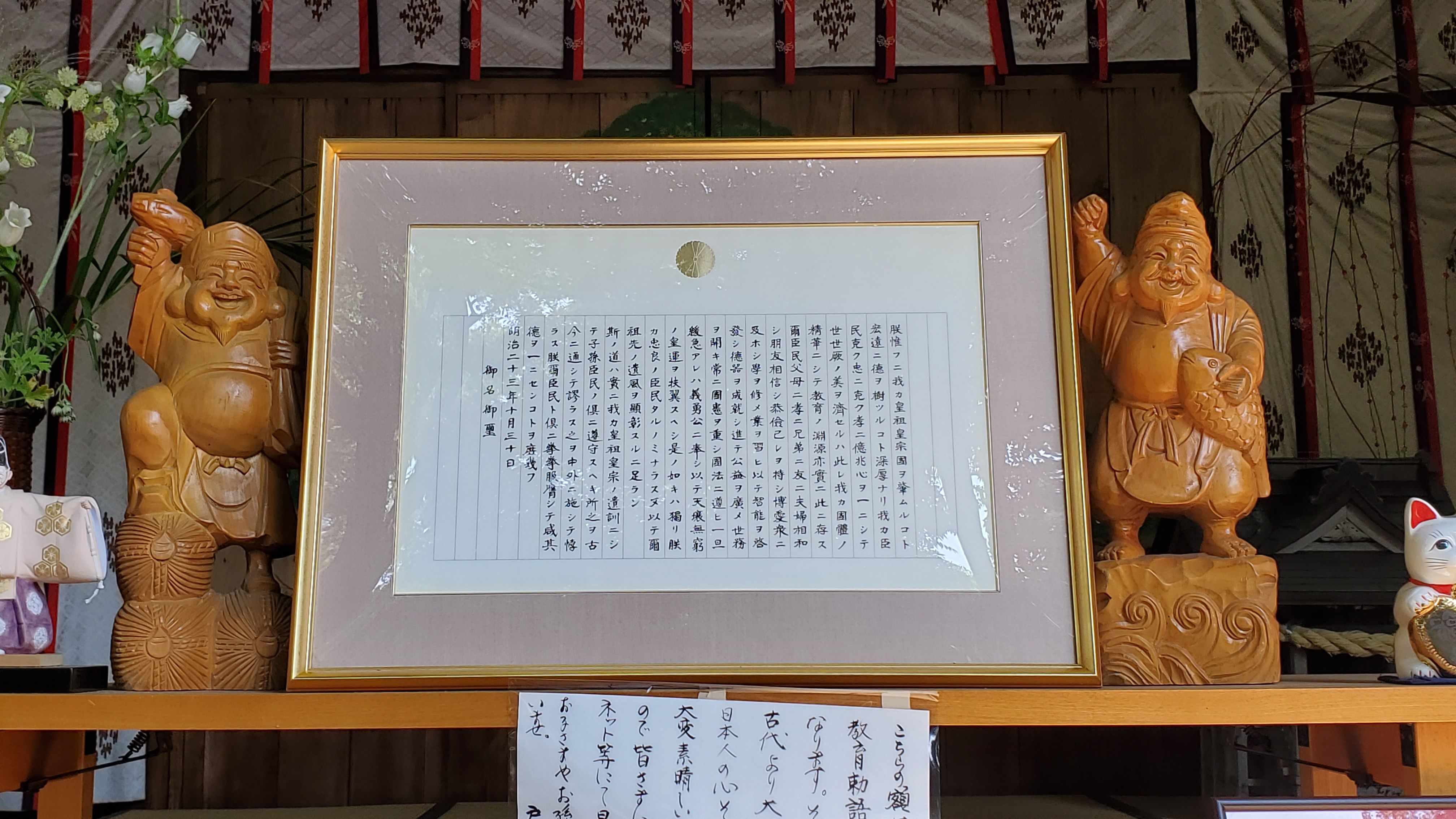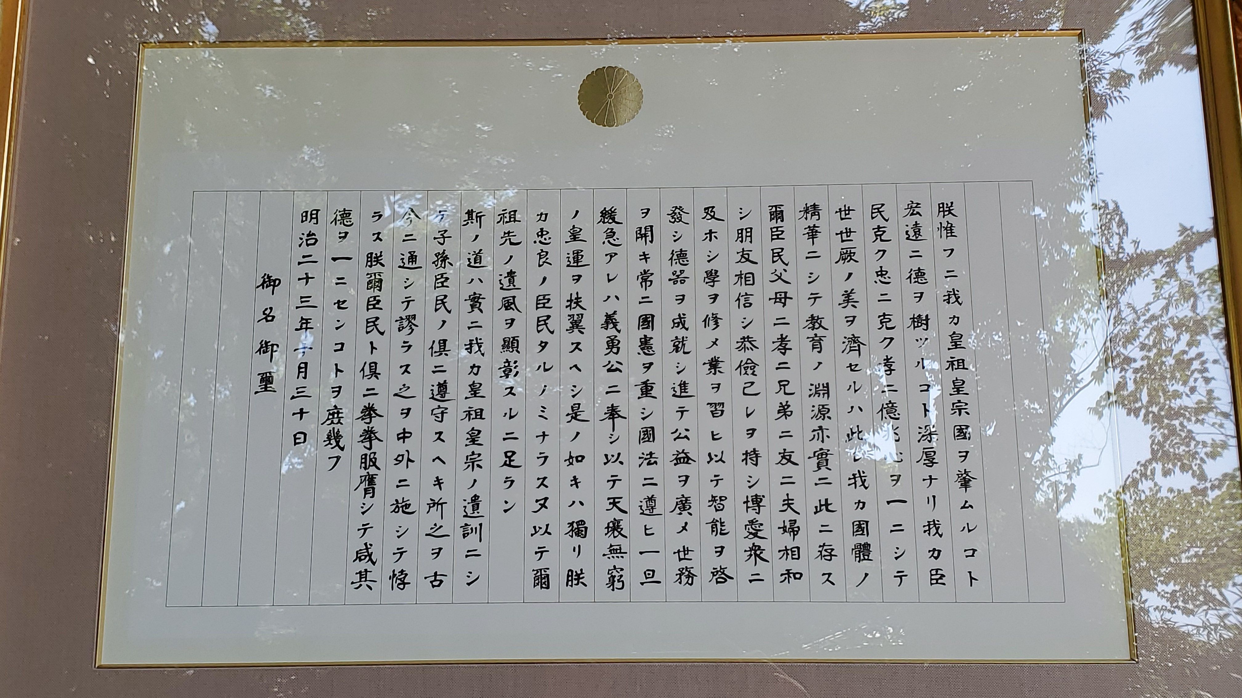 教育勅語……明治天皇による原版の写しだそうです。 金箔の天皇家紋入り。