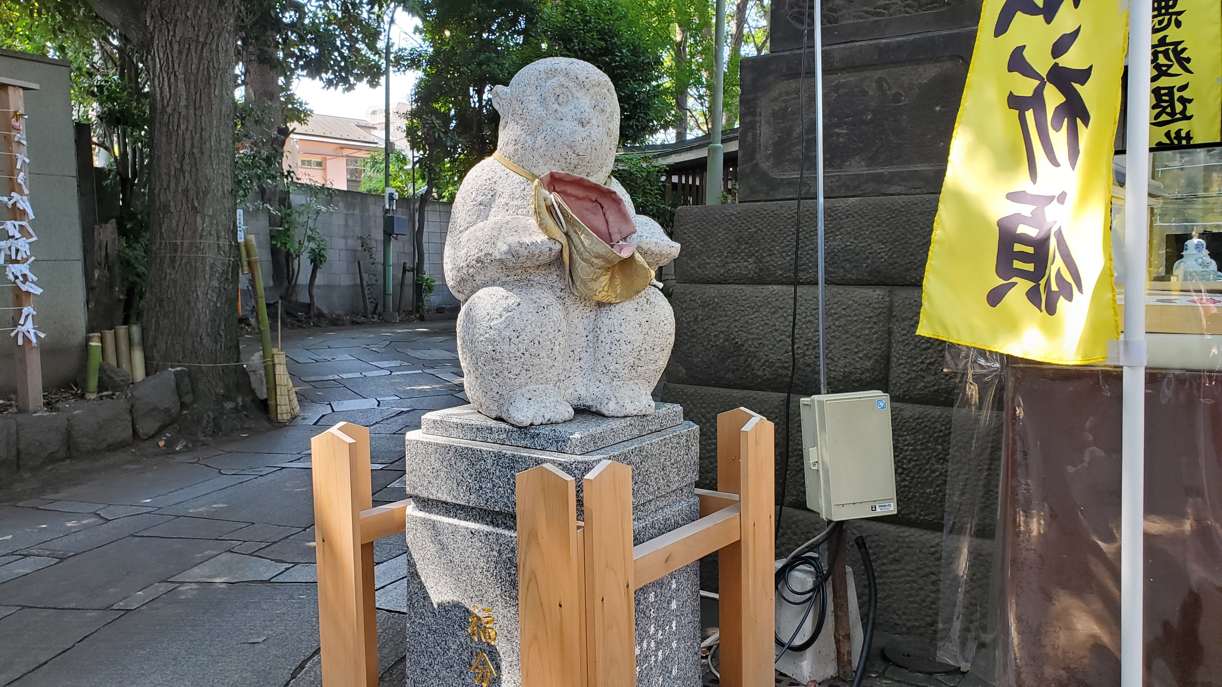 福分け猿……きれいだと思ったら昨年の奉納。右には「幸せうさぎ」の像があったけど、ソファでくつろいでいる方が