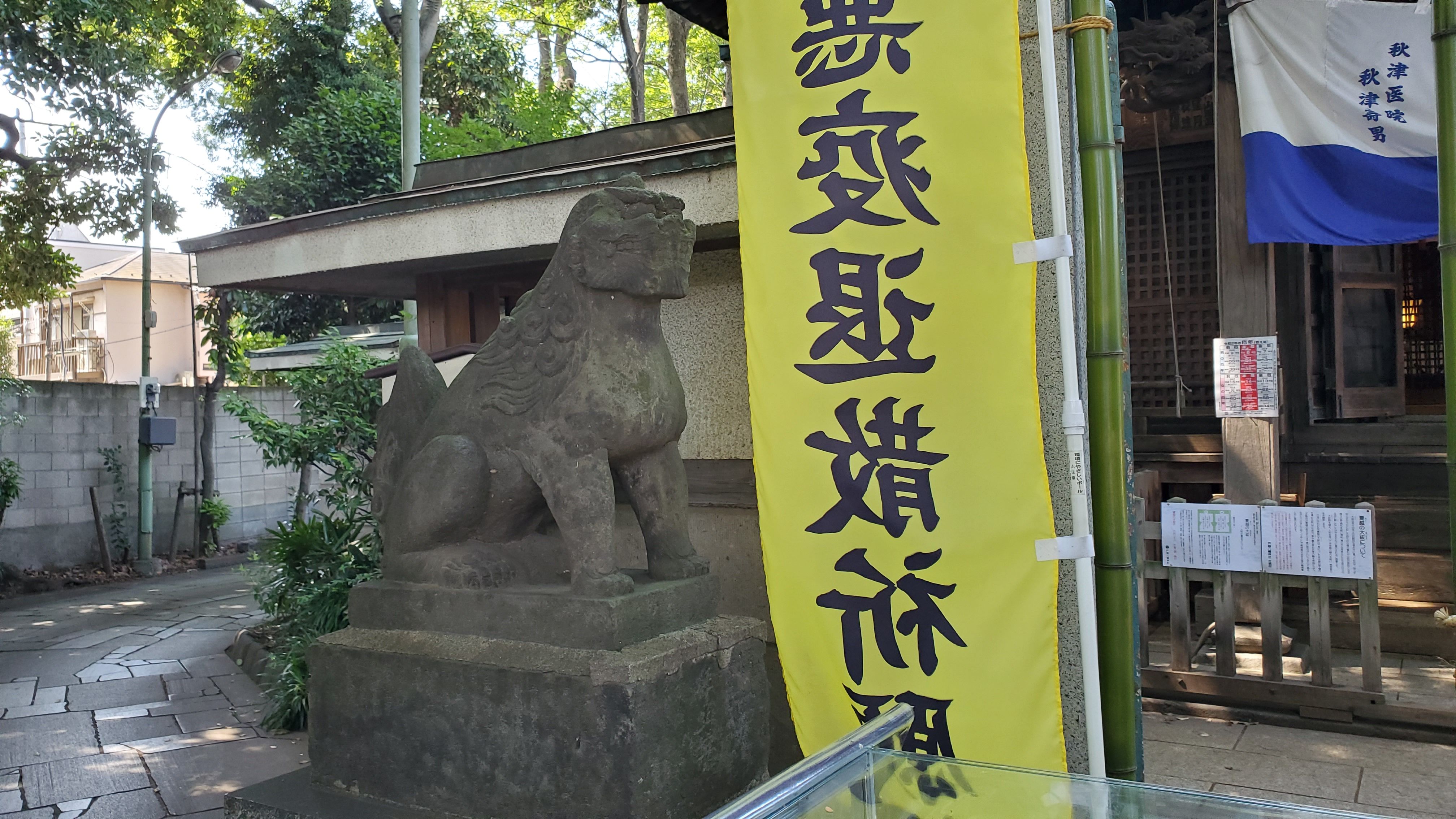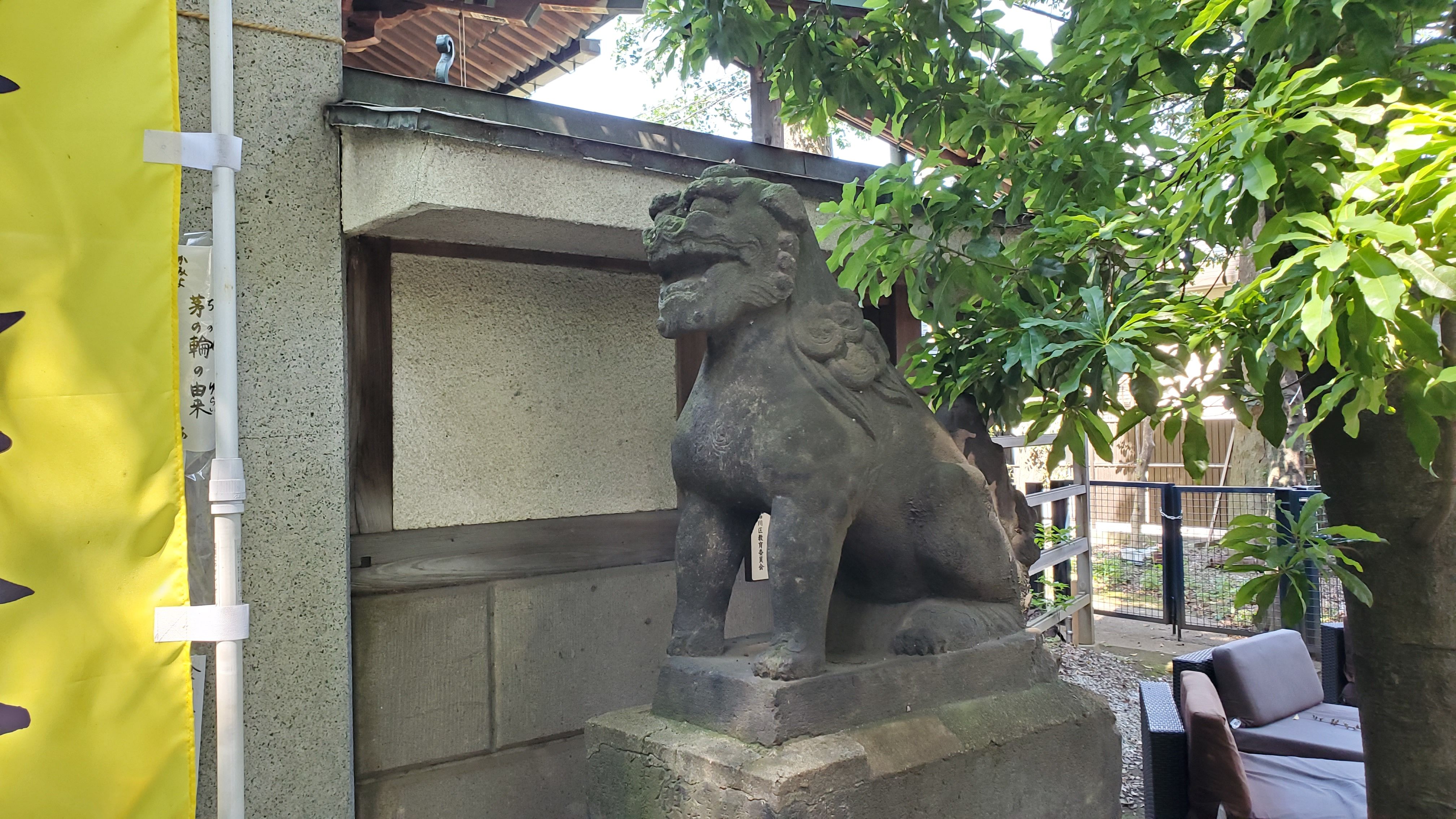 社殿前の狛犬……品川区指定有形文化財。延享3年(1746年)に、戸越村の村民がお金を出し合って奉納したもので、区内最古のものだと。