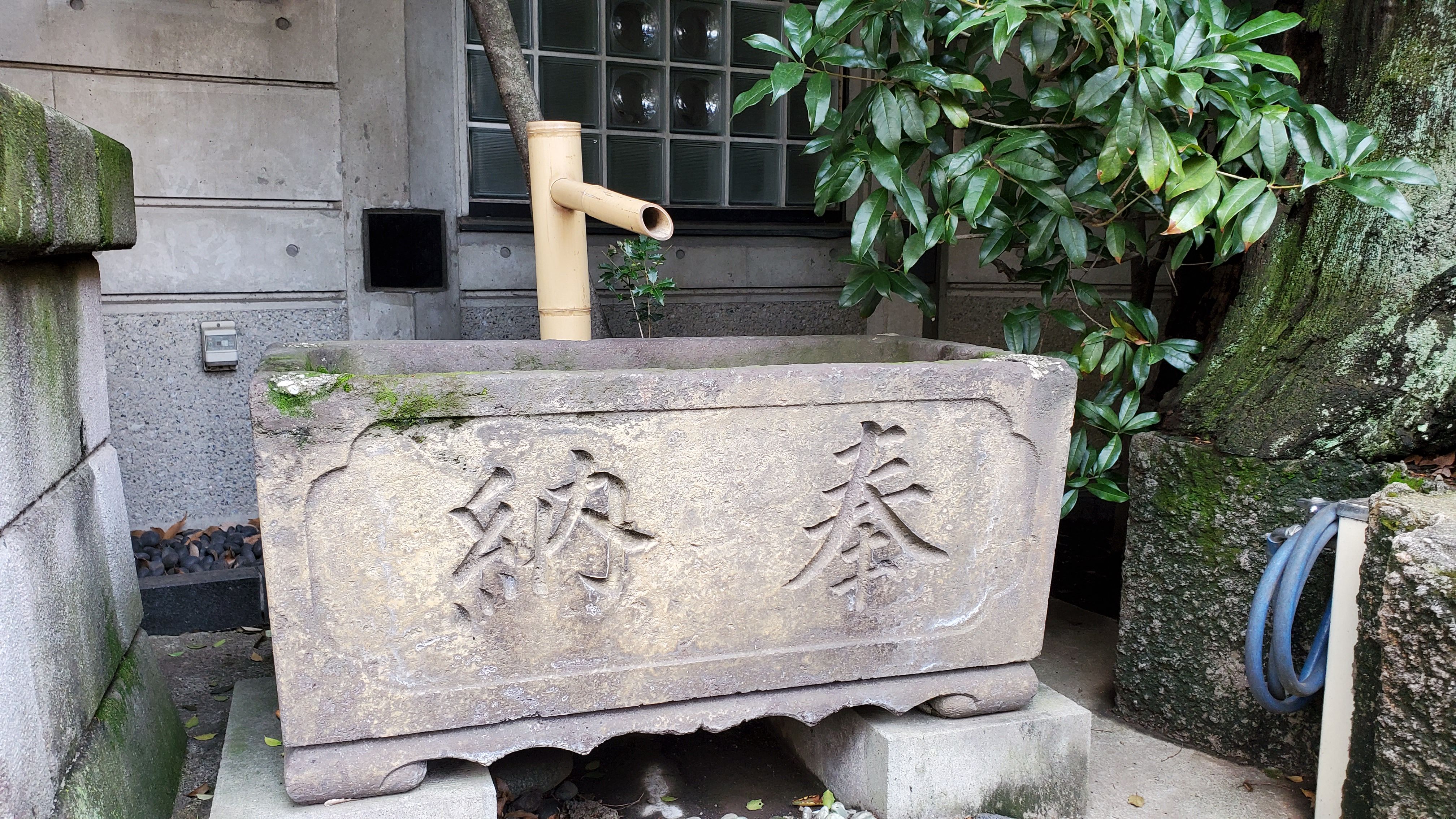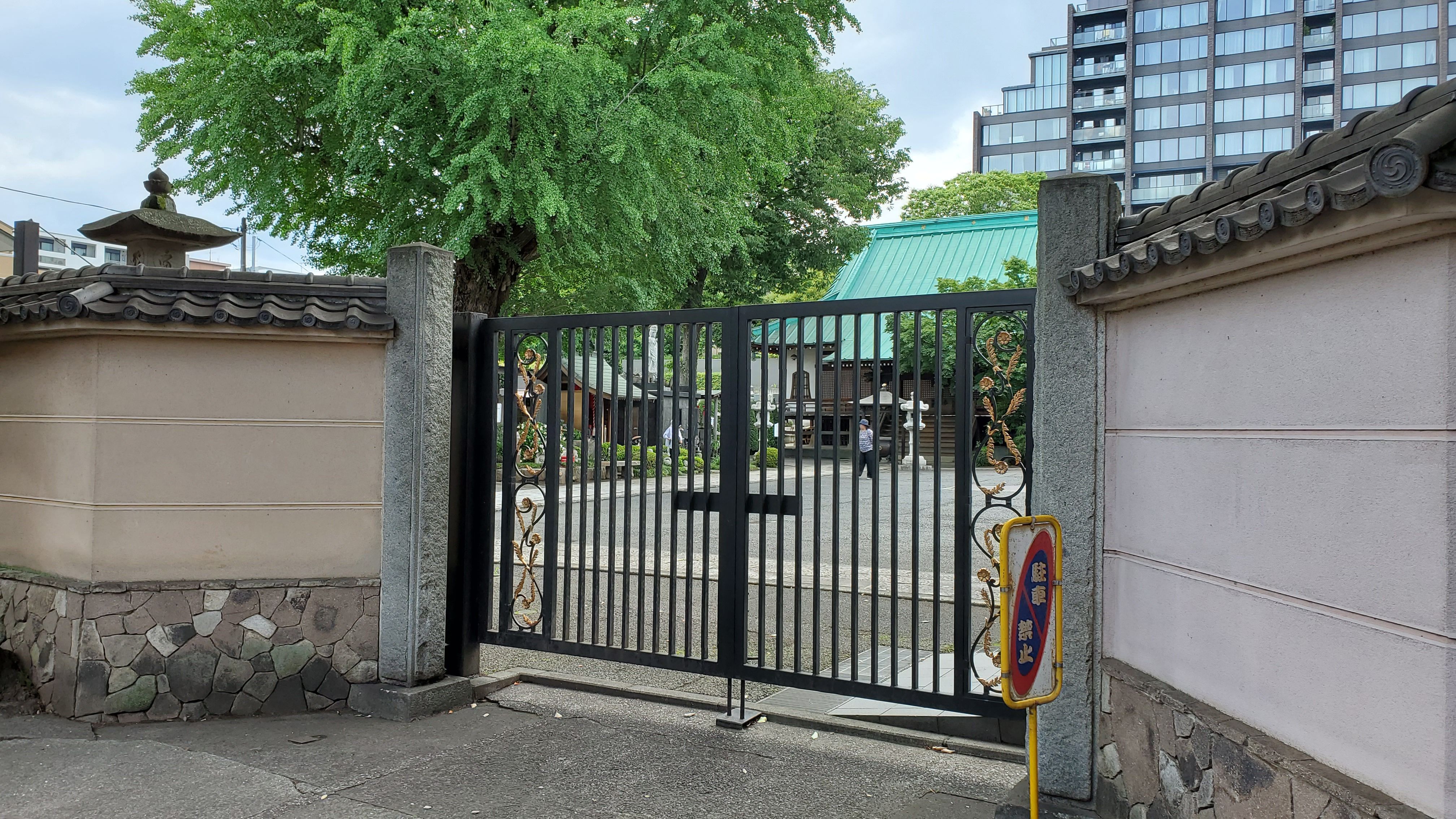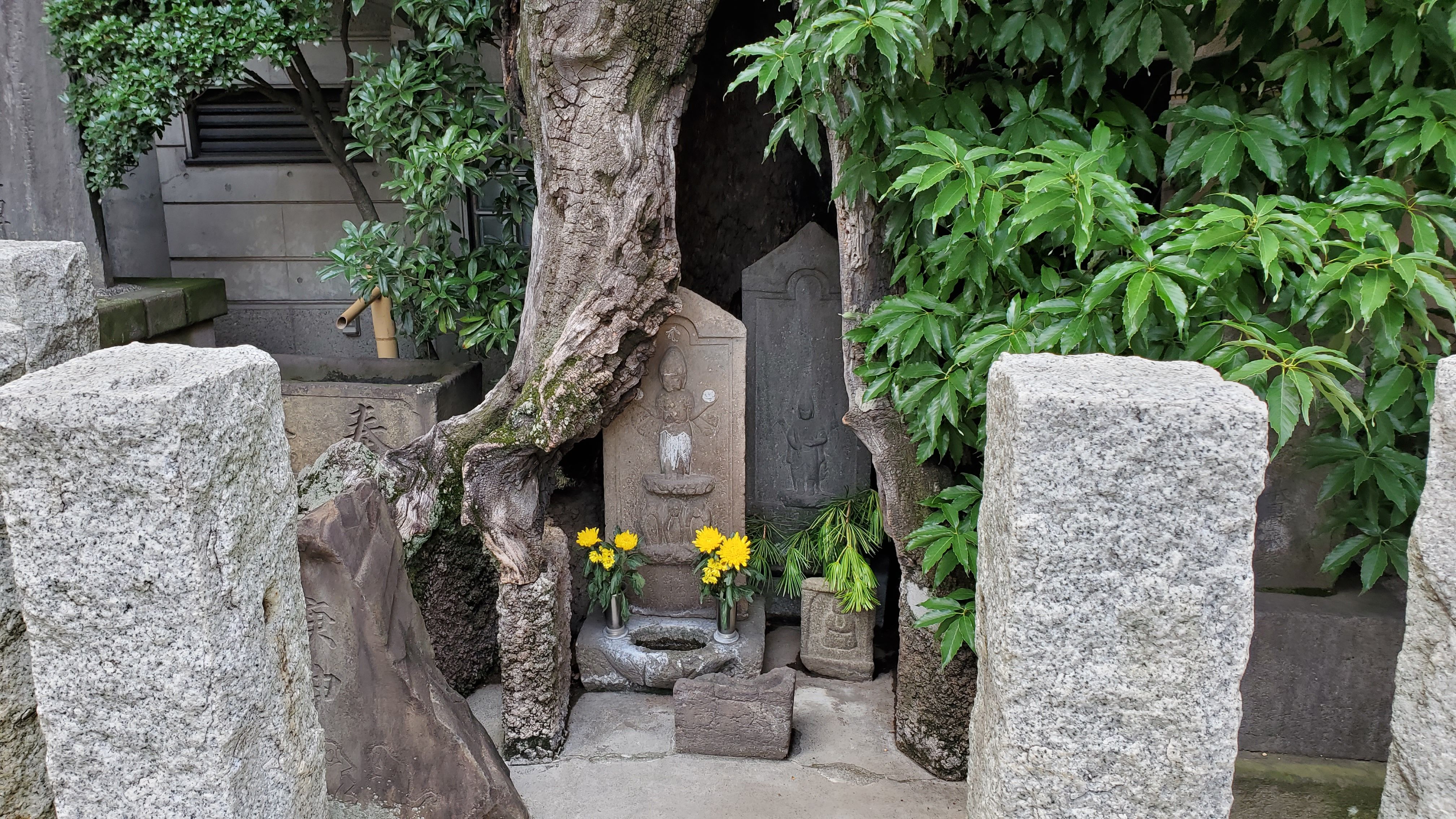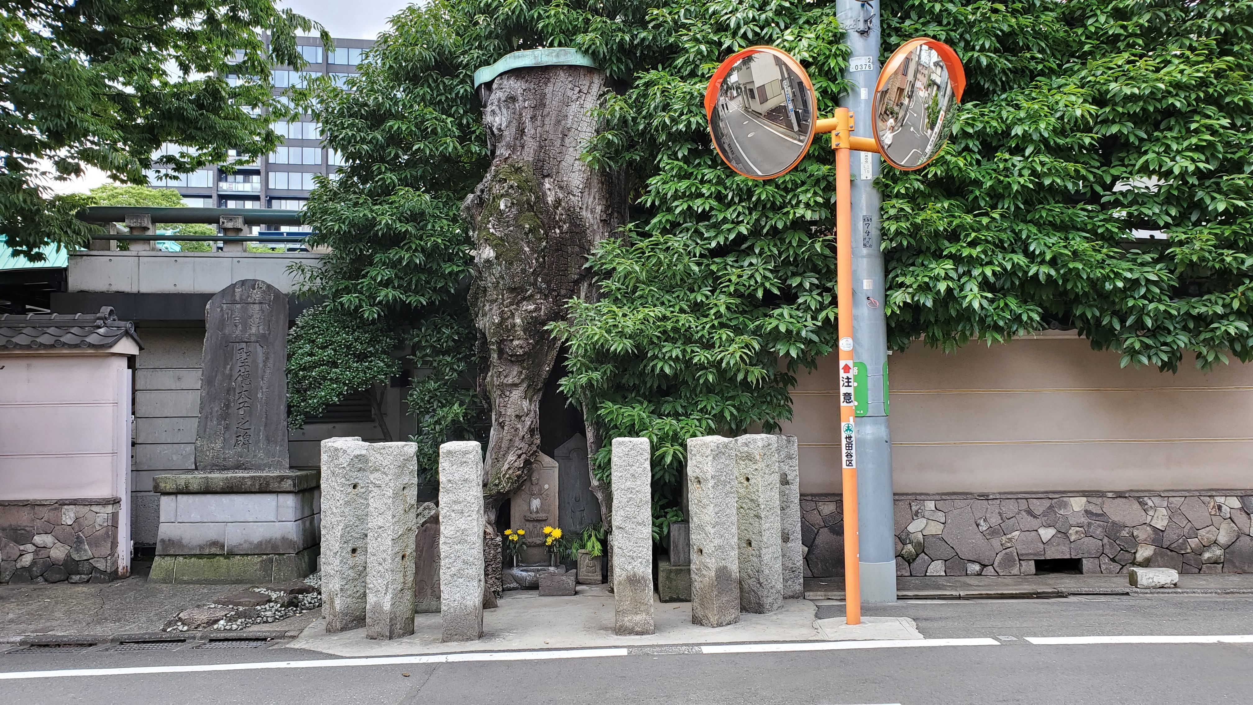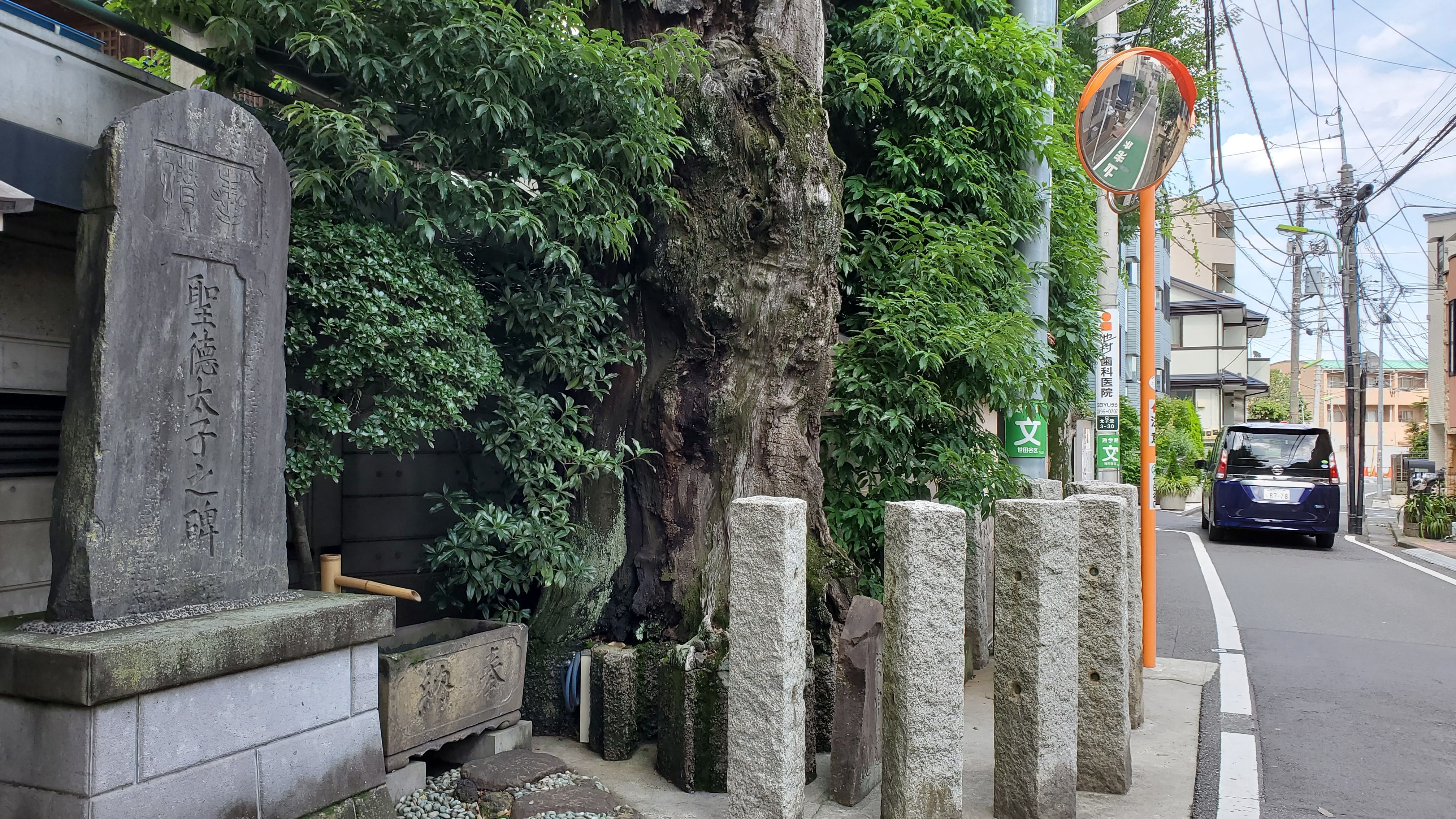 かつて東京都の天然記念物に指定されるほどのケヤキ(欅)の大木だけど、4mほどの高さで伐採されちゃいました。樹齢は700年ほどだったとか……残念……中が空洞だからでしょう、てっぺんに雨よけの蓋がしてありました。