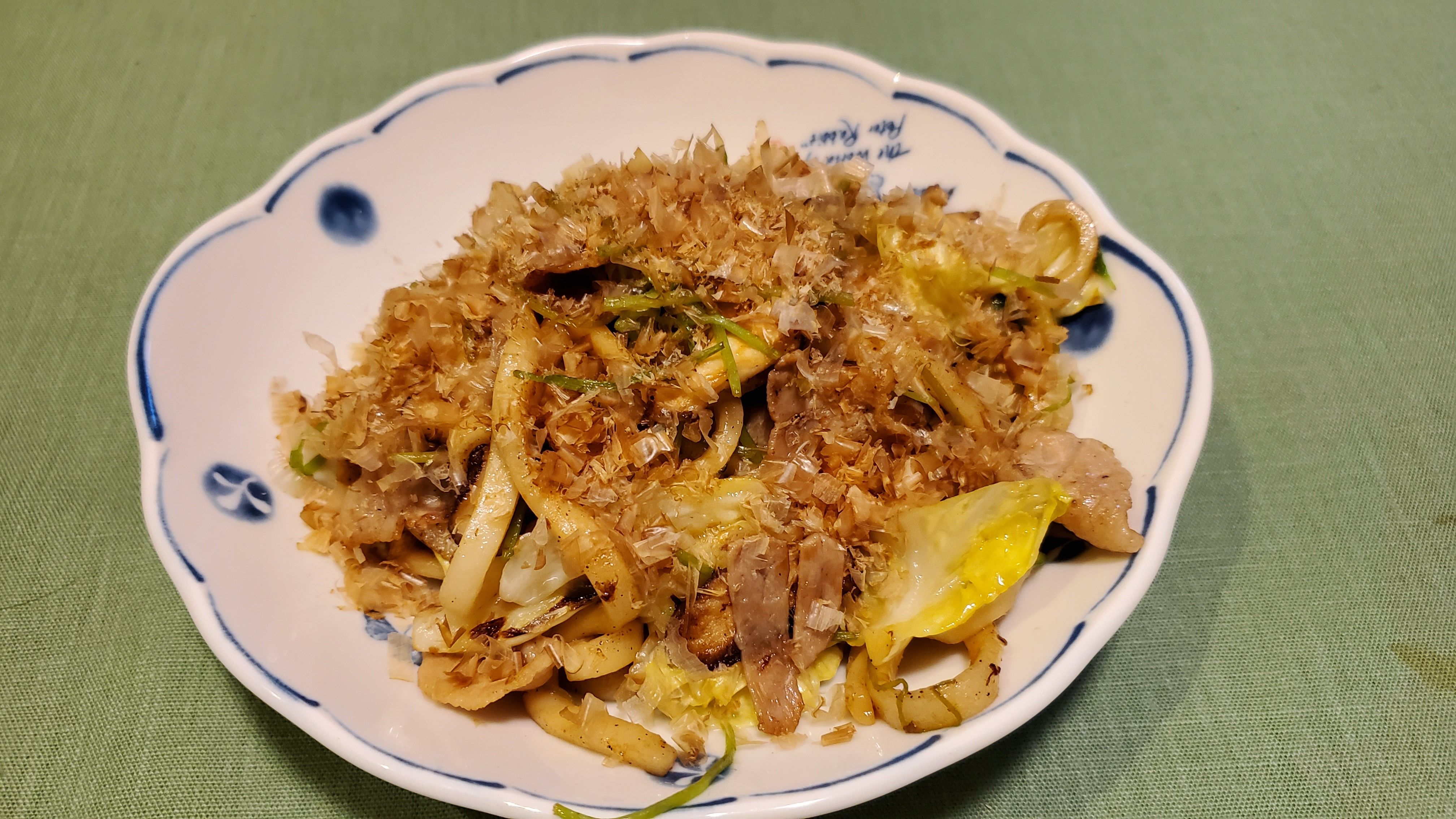 たまに作る「焼うどん」……豚バラ、キャベツ、椎茸、ナルトなど冷蔵庫にあるもので独り作って食べます。かつお節が良い味にしてくれるのでありがたい。「今度紅生姜買うといて~」とお願いしたら、連れ合いは早々に調達済でした。昨日も草むしり、ごくろうさまでした。おーきにね~