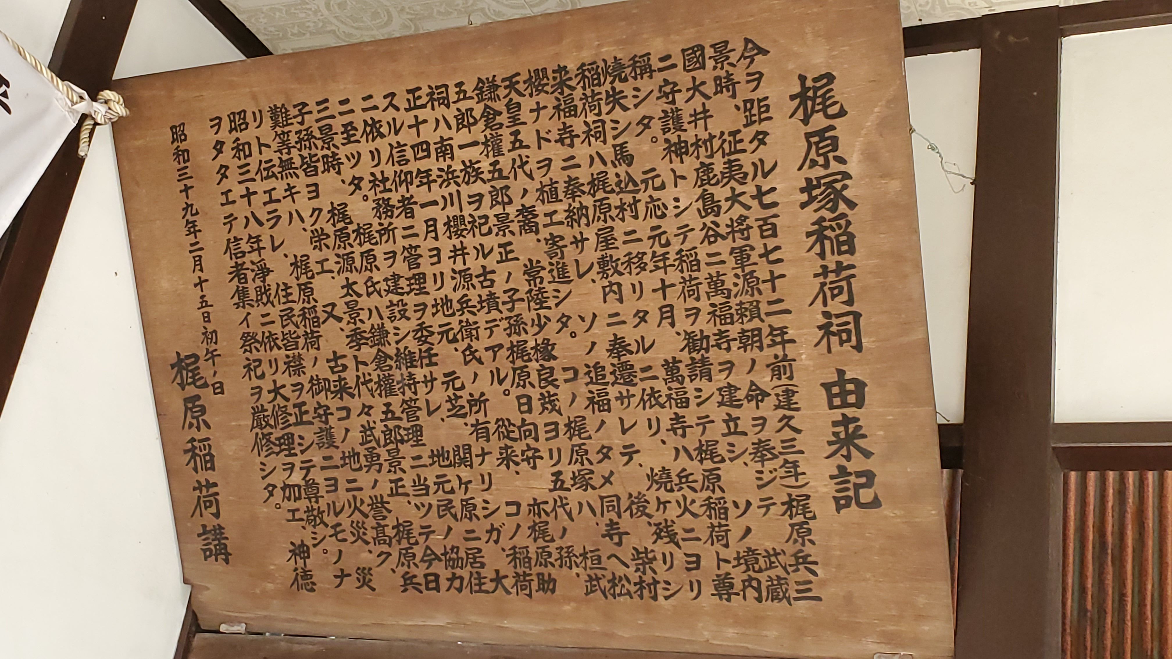 今ヲ距タル七百七十二年前(建久三年・ 1191年 )梶原兵三景時、征夷大将軍源頼朝ノ命ヲ奉ジテ、武蔵國大井村鹿島谷ニ萬福寺ヲ建立シ、ソノ境内ニ守護神トシテ稲荷ヲ勧請シテ梶原稲荷ト尊称シタ。
