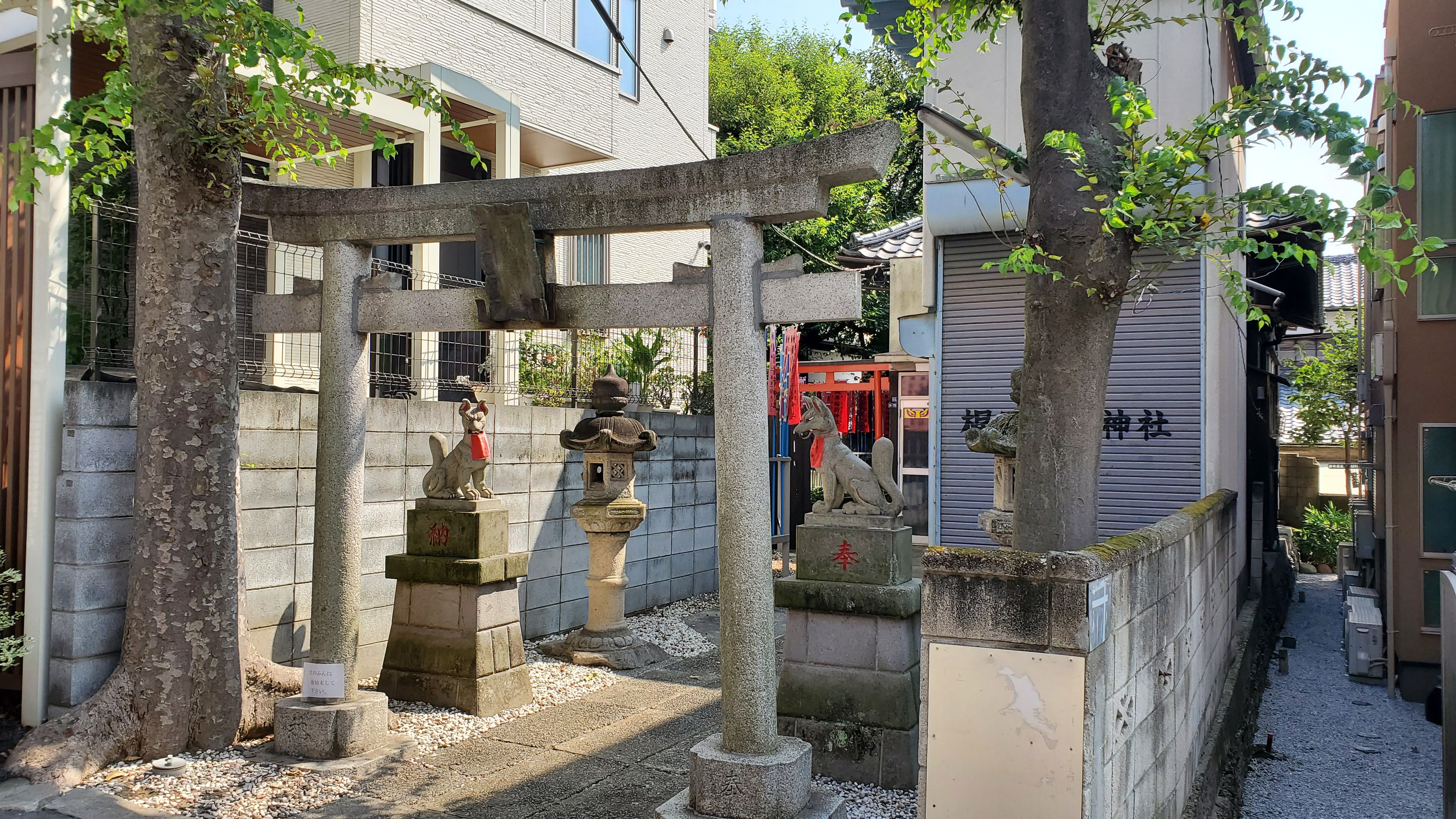 元応元年 (1319年) 十月、萬福寺ハ兵火ニヨリ焼失シ馬込村ニ移リタル依リ、焼ケ残リシ稲荷祠ハ梶原屋敷内ニ奉遷サレテ、後、柴村来福寺ニ奉納サレ、ソノ追福ノタメ同寺ヘ松櫻ナドヲ植エ寄進シタ。