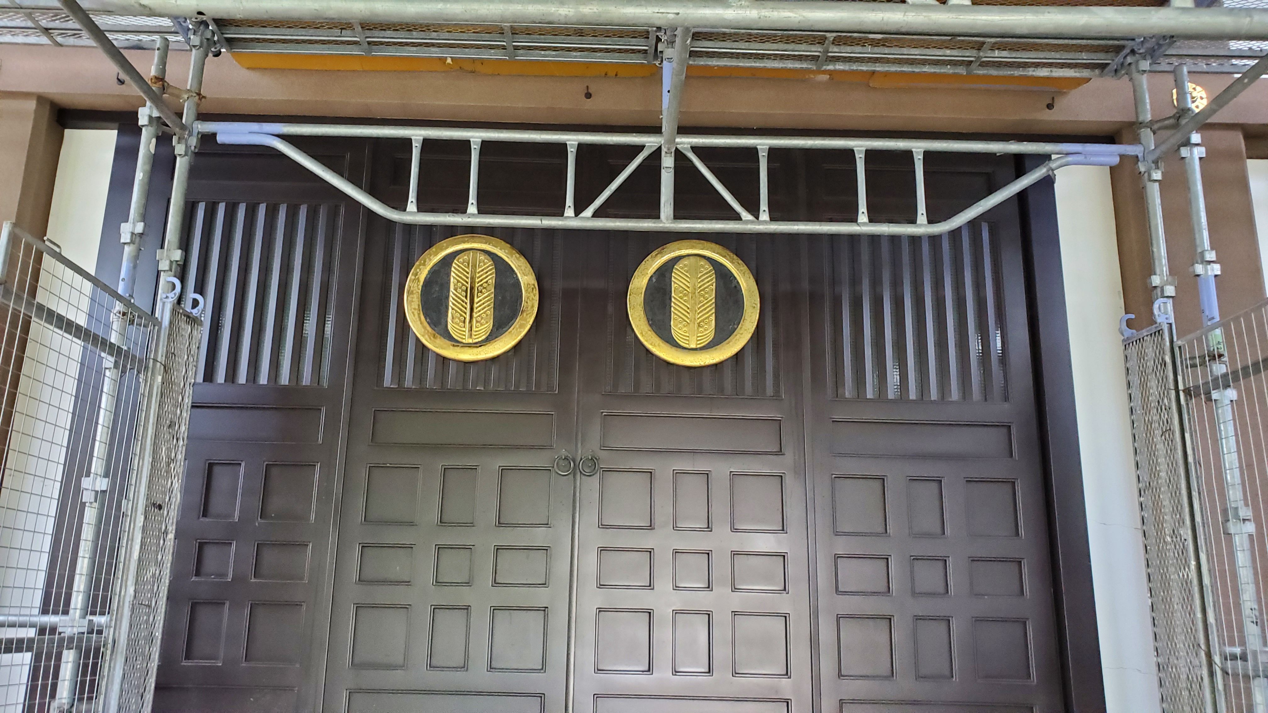 本堂は現在改修工事中でしたが、寺紋でしょうか?  本尊は阿弥陀如来とのことです。