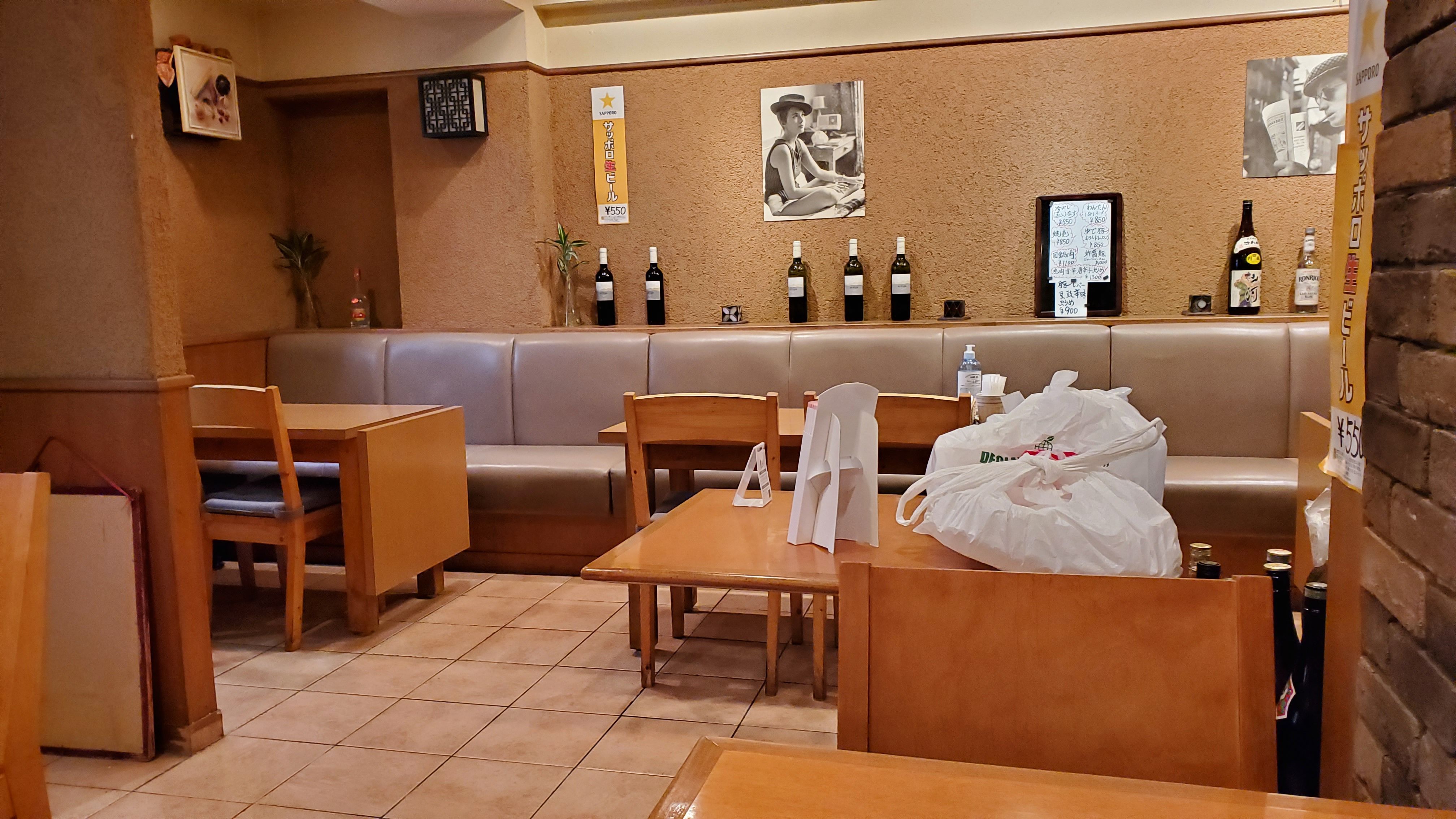 2軒となりの喫茶店・暇を売る店でコーヒーを飲みながら新聞を読み、シネマの開店時に一番オーダー。調理が済むと内線電話で知らせてくれます。いつもは喫茶店まで出前をしてもらうのだけど、今日は雨だから足を運びました。
