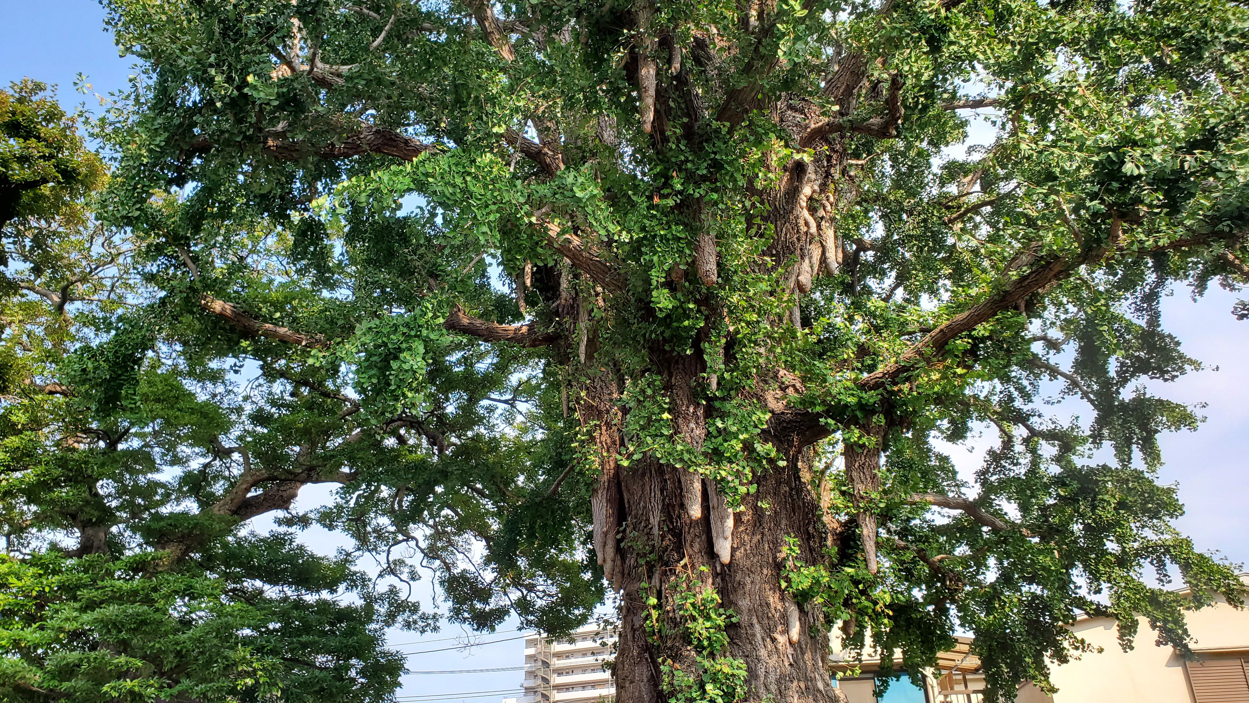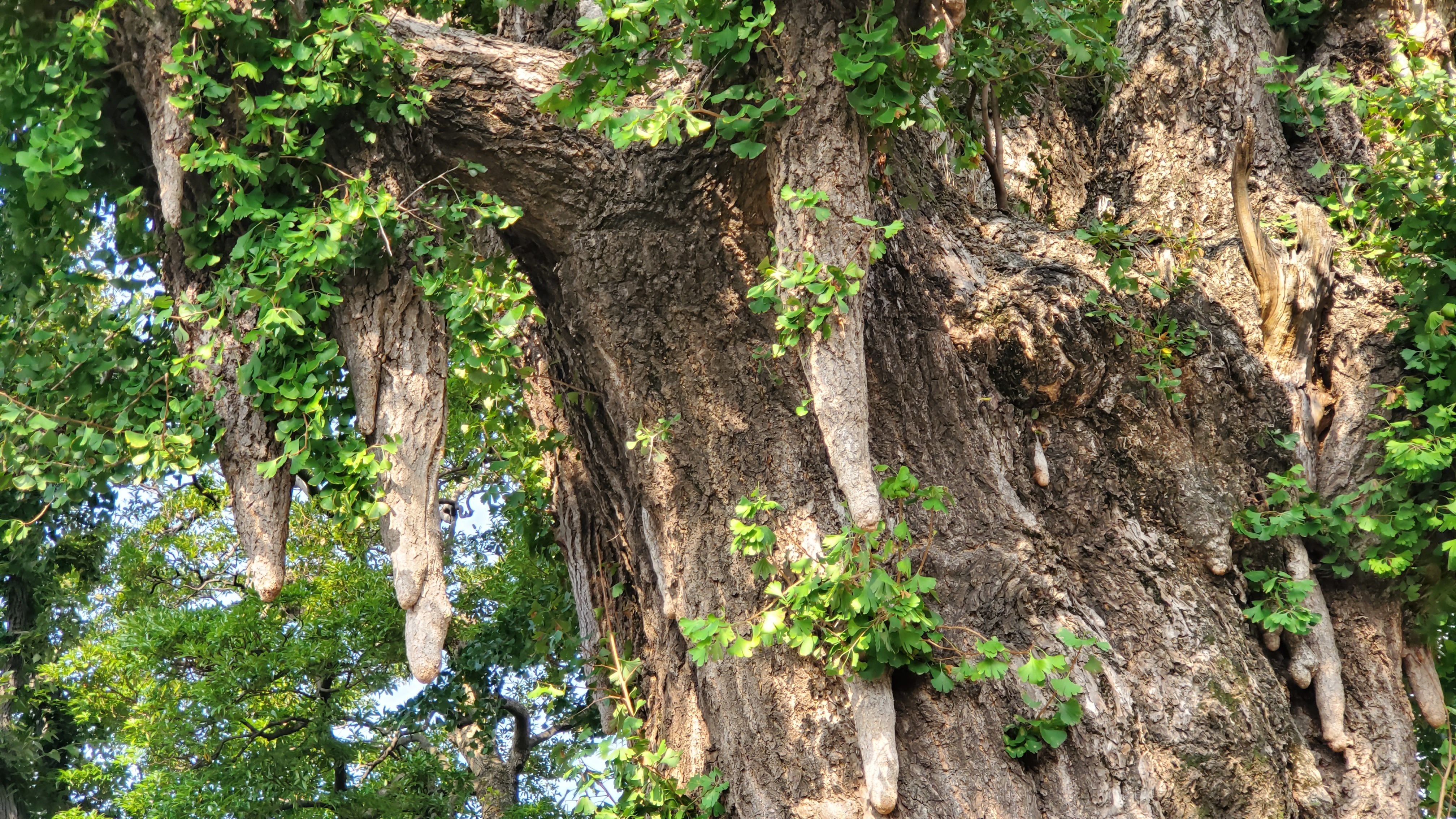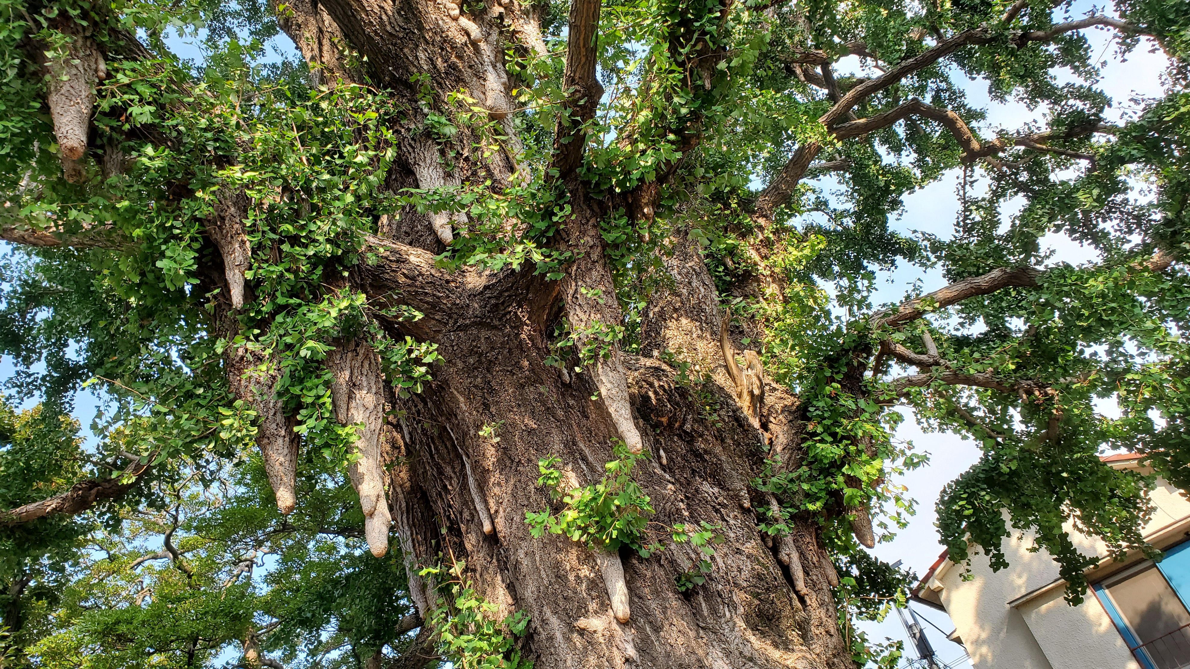 麻布・善福寺の「さかさイチョウ」から一枝を譲り受けて育てたイチョウですね。しかし太い……幹廻りは、なんと7.2メートル。